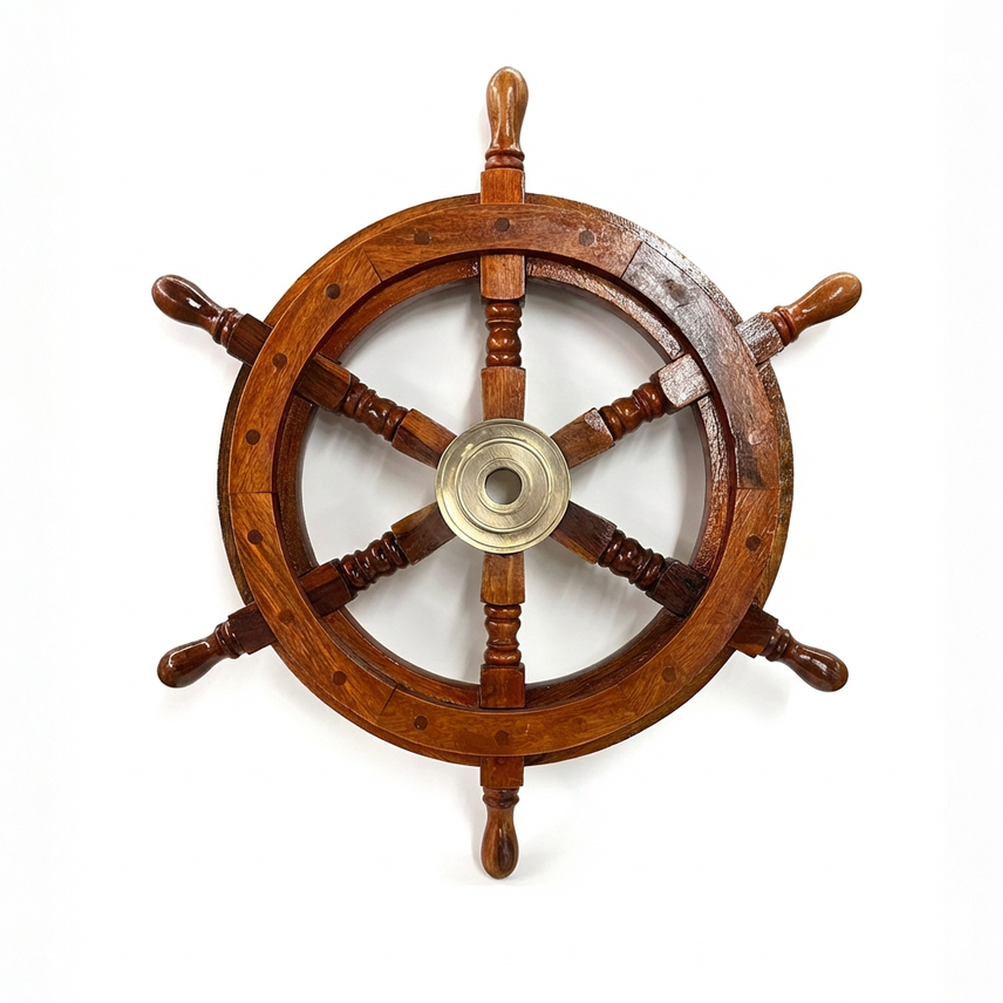 Need some seaworthy decor for a photoshoot or film set? This wooden ship wheel is a great prop to hang on the walls of a local watering hole by the sea, the inside of a captain's deck, or a naval officer's room. The classic 6 peg wheel with a brass hub is an instantly recognizable symbol that elevates any set. Throw some fishing nets over it or even a fake seagull for a more authentic look to bring this prop to its highest level of decoration.