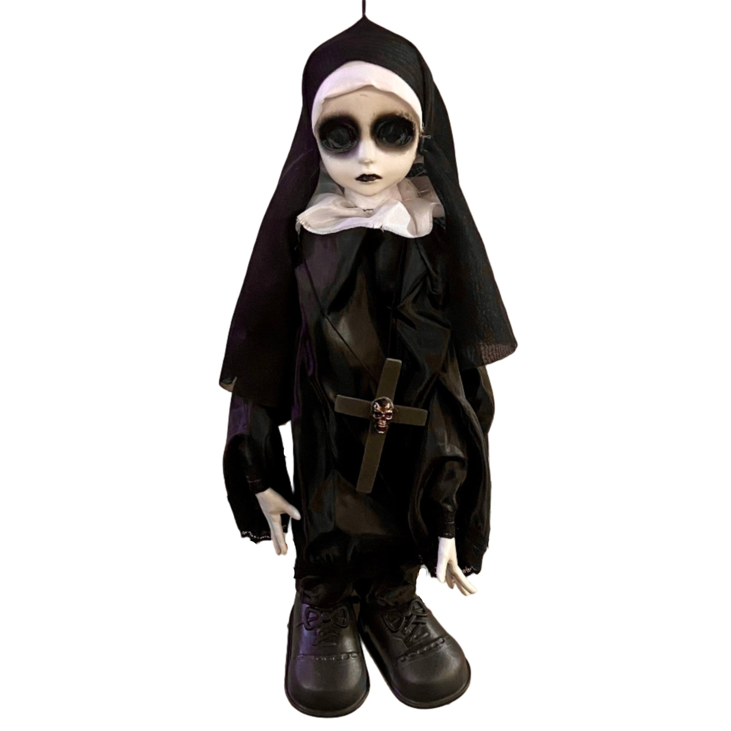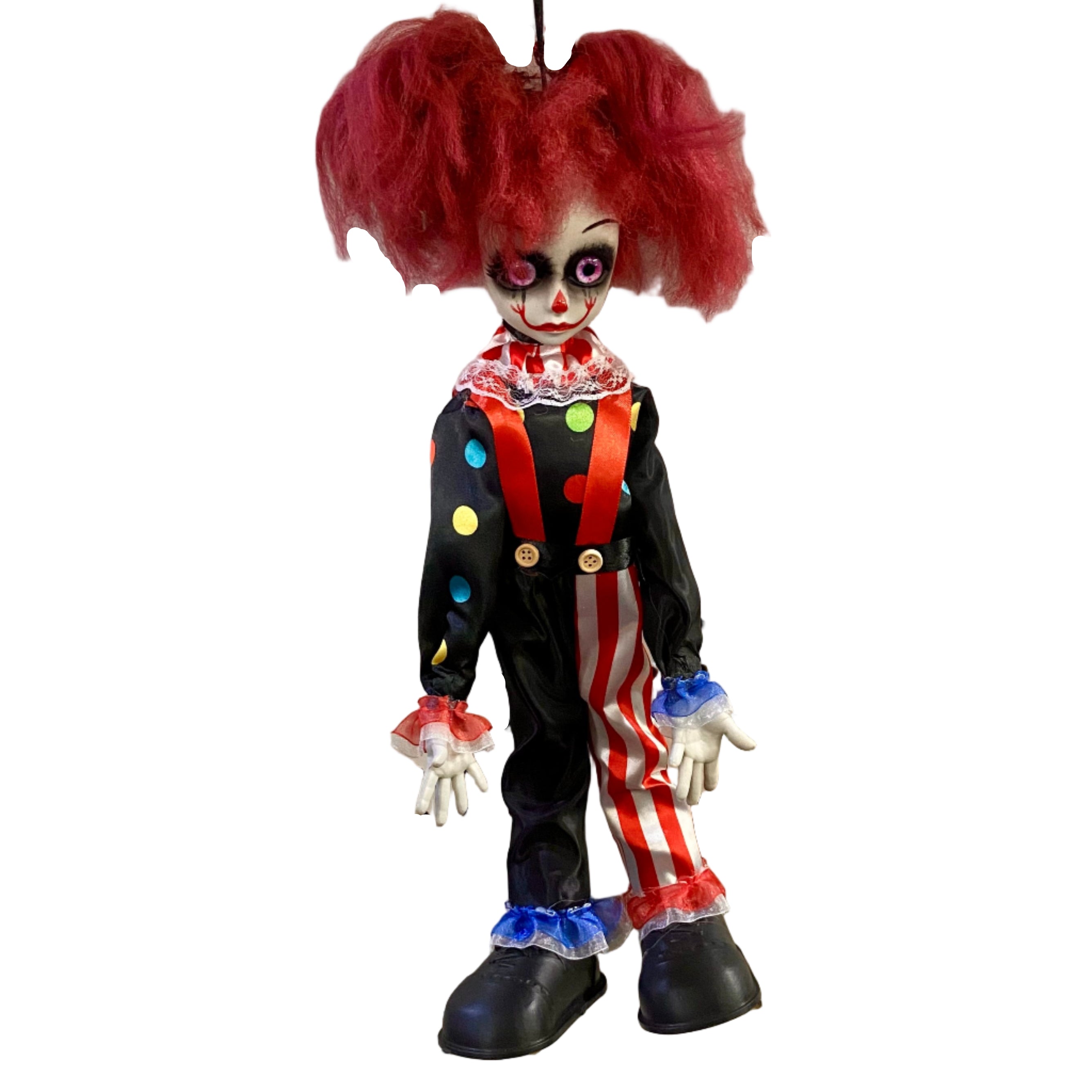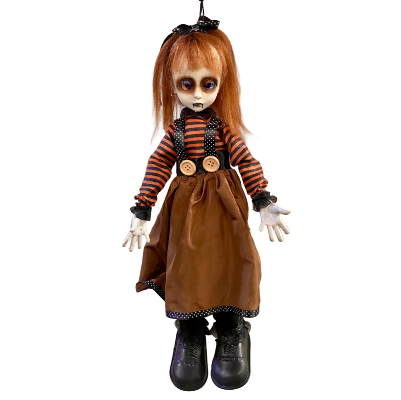 She wants to play with you. We suggest doing whatever she says. This Hanging Creepy Big Eye Doll features posable limbs and has an attached ribbon loop for an extra-creepy addition to your wall or ceiling decor.