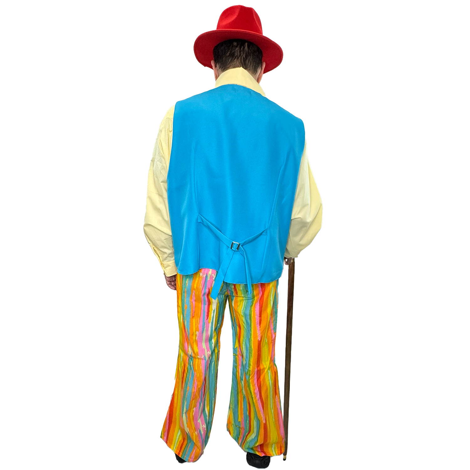 Travel back to the 70s in style with our 1970s Men Premium Pastel Party Set. This groovy costume includes a pastel cream shirt, pastel blue vest, and rainbow pants, available in sizes XL and 2X for rent or purchase. Complete the look with additional accessories, available online or in-store.