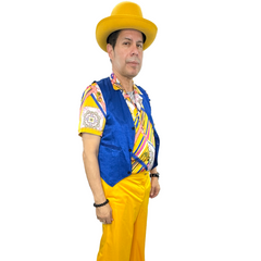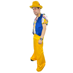 Step back in time with our 1970s Men's Gold Leisure Outfit Adult Costume! This retro, groovy ensemble includes yellow pants, a patterned shirt, and a blue vest, available to rent or buy in size large. Complete the look with additional accessories, available for purchase online or in-store. Channel your inner disco king with this stylish and authentic outfit.