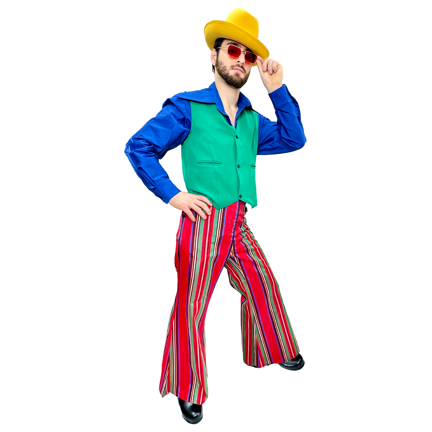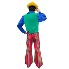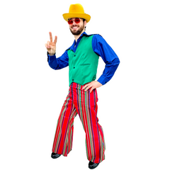 Get your groove on with this 1970s Rainbow Party Men's Adult Costume. Featuring red striped bellbottoms, a blue shirt, and a mint green vest (size XL), this outfit will transport you back to the groovy era. Mix and match with your favorite hat and accessories (sold separately) to complete the look!