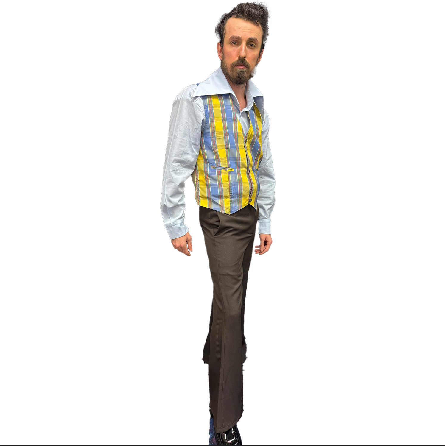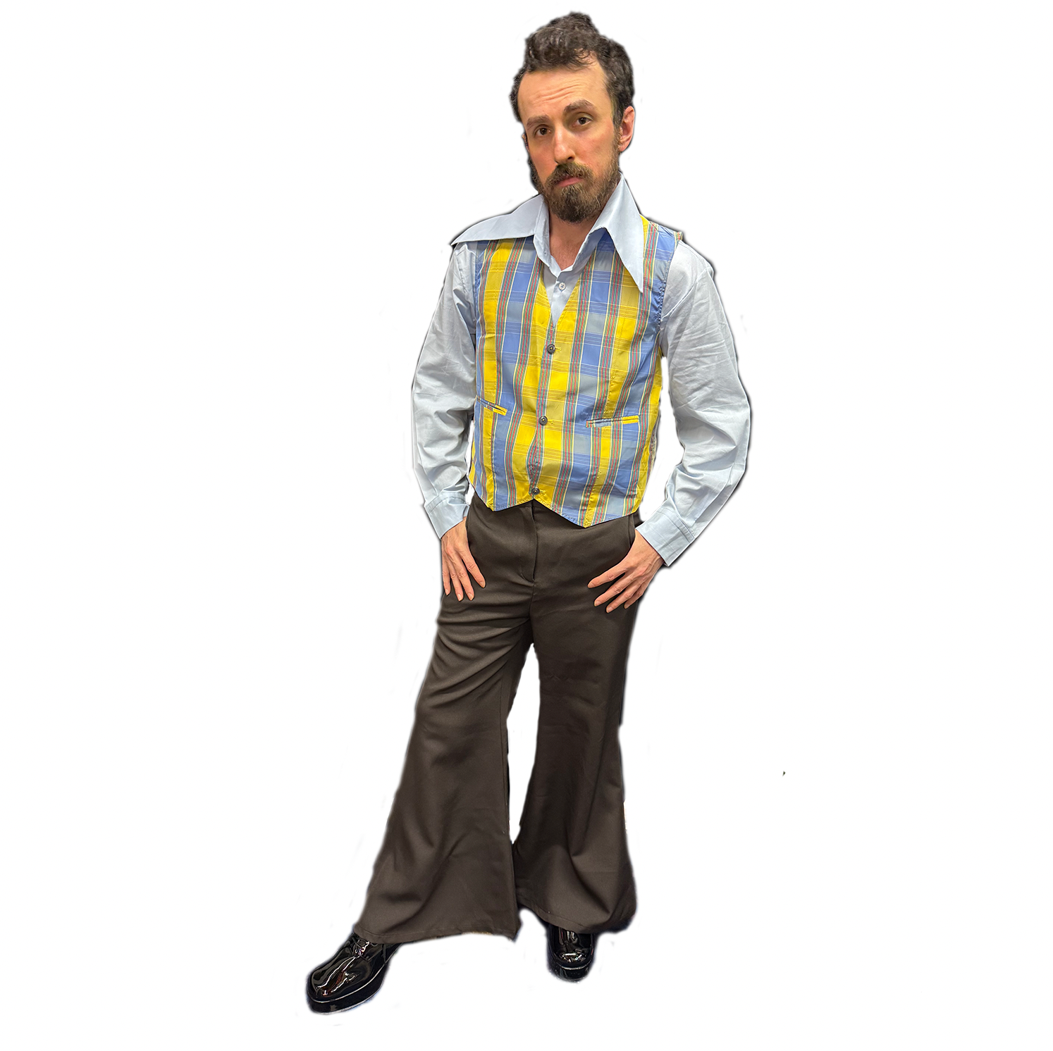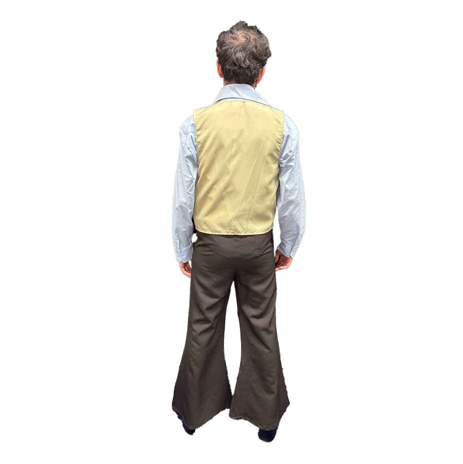 Step back in time with this 1970s Yellow Party Set Men's Adult Costume. Handmade with a plaid vest and black bellbottom pants, paired with a blue button up, this costume is perfect for your next party. Available in sizes medium and large, complete the look with wigs and accessories available in-store or online.