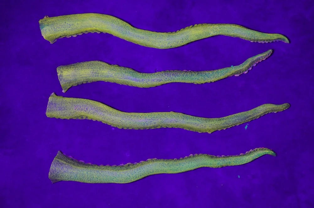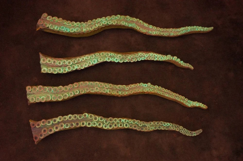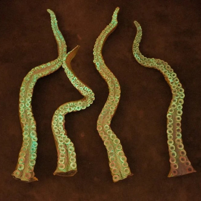 Did you know that octopus tentacles can operate independently of one another because they contain so many neurons, they basically each have their own little brain? Try not to think about it the next time you order fried calamari. These massive 2' Octopus Posable Tentacle Blacklight Props look as cool in regular light as they do under UV lights, and can be fully bent, wrapped, or twisted into any position you want! Great for theatrical productions, haunted houses, or theme party decor.