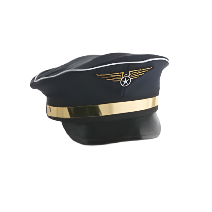 Get yourself in gear with this authentic looking Airline Pilot Cap! This black captain hat features a metallic gold band, white piping detail, and an embroidered aviator patch that makes for a perfect pilot costume.
