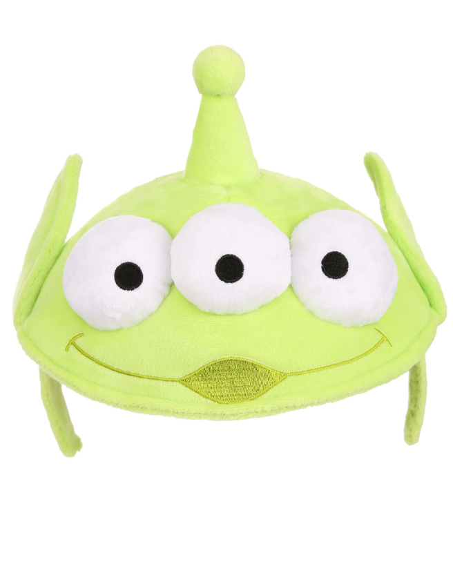 This headband will cover the front half of the top of your child’s head. The entire headband is a bright green and features soft-sculpted facial features of the little green aliens. There is a single antenna at the top of the alien’s head, two pointy green ears—one on either side--and three big bulbous eyes. The alien’s mouth is embroidered under the eyes.