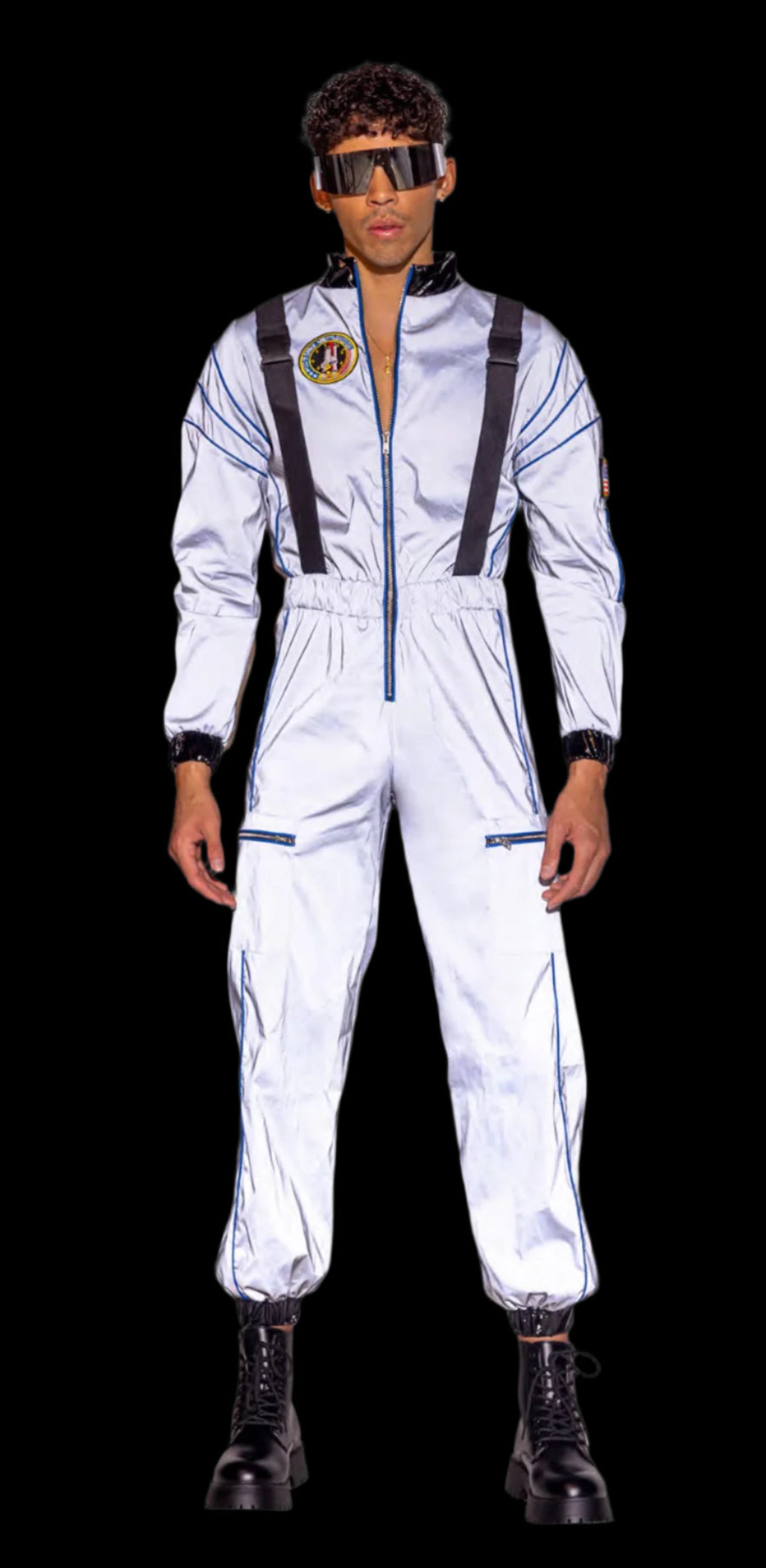 - Zip front long sleeve silver jumpsuit with reflective finish, attached straps, embroidered patches and multiple zippers
