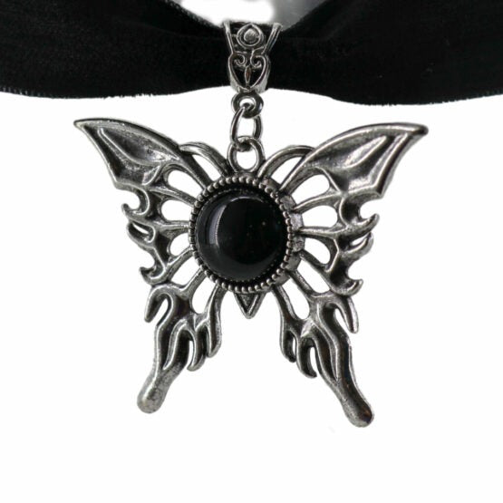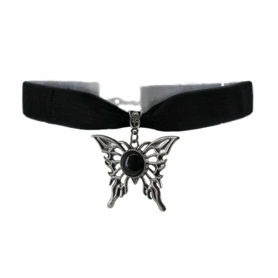 Embrace your inner witch with this black butterfly choker, adorned with a sparkling gem that catches the light just right. Perfect for adding a touch of 90s goth charm with a boho twist, it’s a playful accessory that flutters between dark elegance and whimsical style. Whether you're casting spells or just turning heads, this choker brings a magical edge to any outfit.