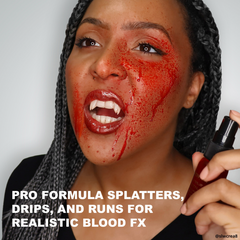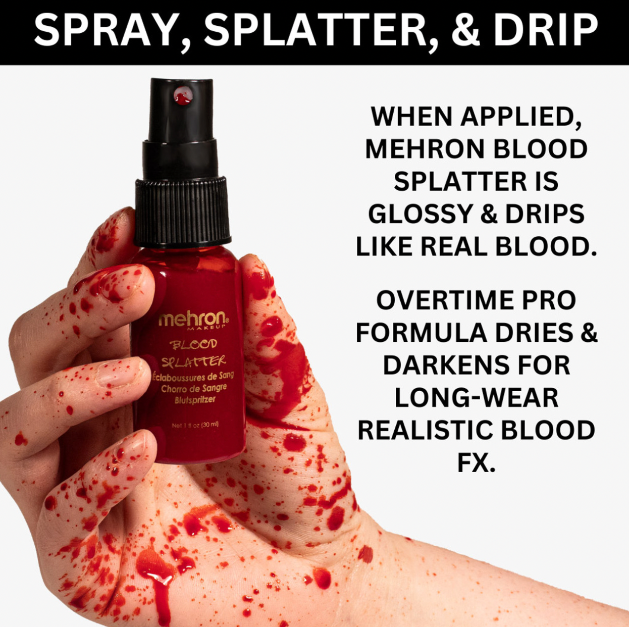 Blood Splatter will drip and run like real blood. Over time, sprayed blood will dry, darken, crust up, and crack just like real blood for the most realistic FX! Great for finishing off SFX makeup, sets, props, and more. Available in a convenient, easy to use 1 fl oz (30 ml) spray bottle.