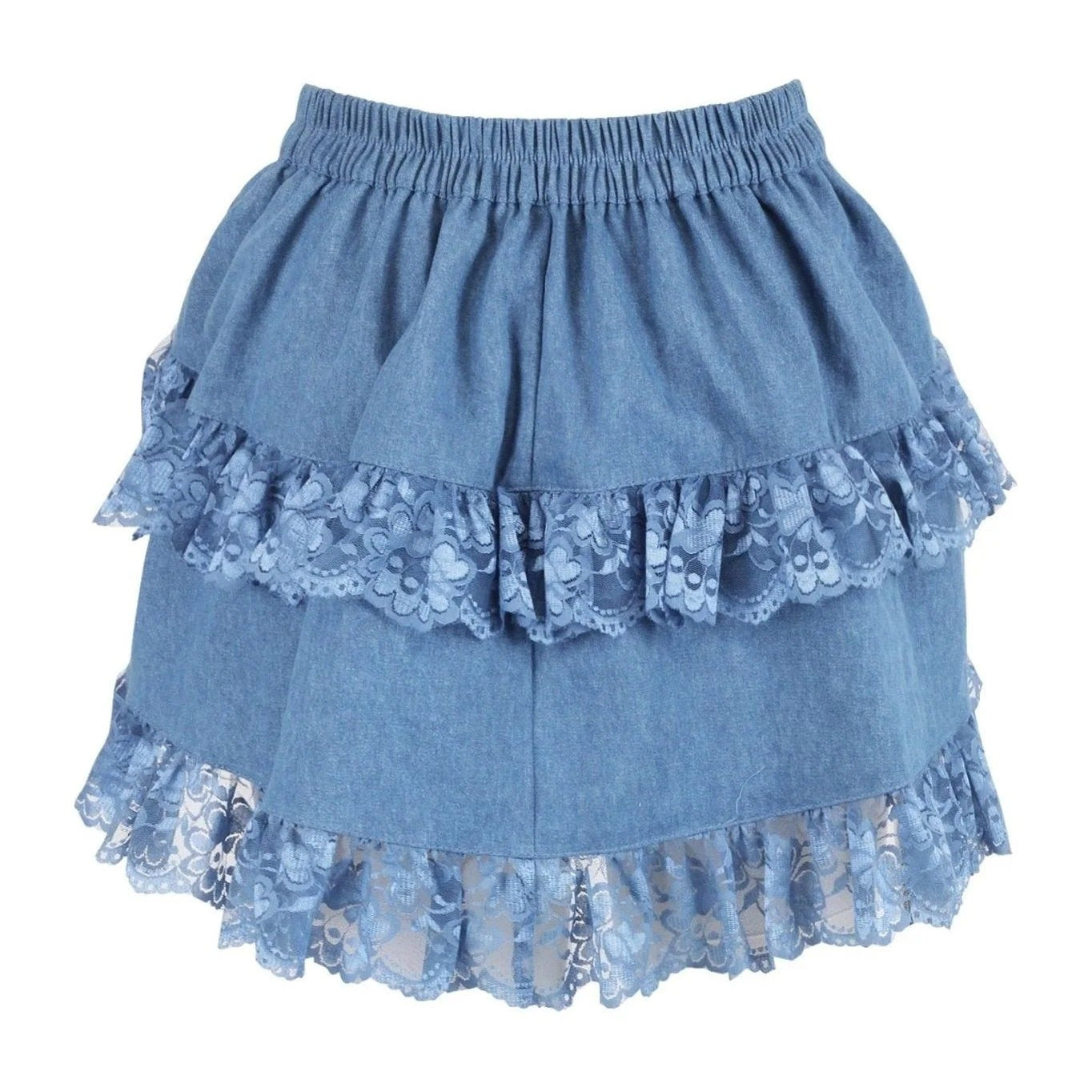 This playful blue denim skirt features a ruched bustle detail and delicate lace trim for a flirty finish. The elastic waistband ensures a comfy fit, while the adjustable drawstring underneath lets you customize the length to match your mood or occasion. Perfect for adding a fun twist to your everyday style!