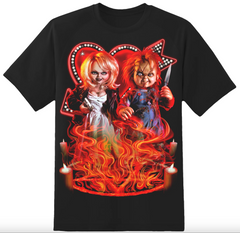 Get ready to tie the knot (around your neck) with our Bride of Chucky Tee! This tee features a quirky, playful design and is perfect for any horror fan. You'll be the bride of the party in this fun and stylish tee. (Murderous doll not included.)