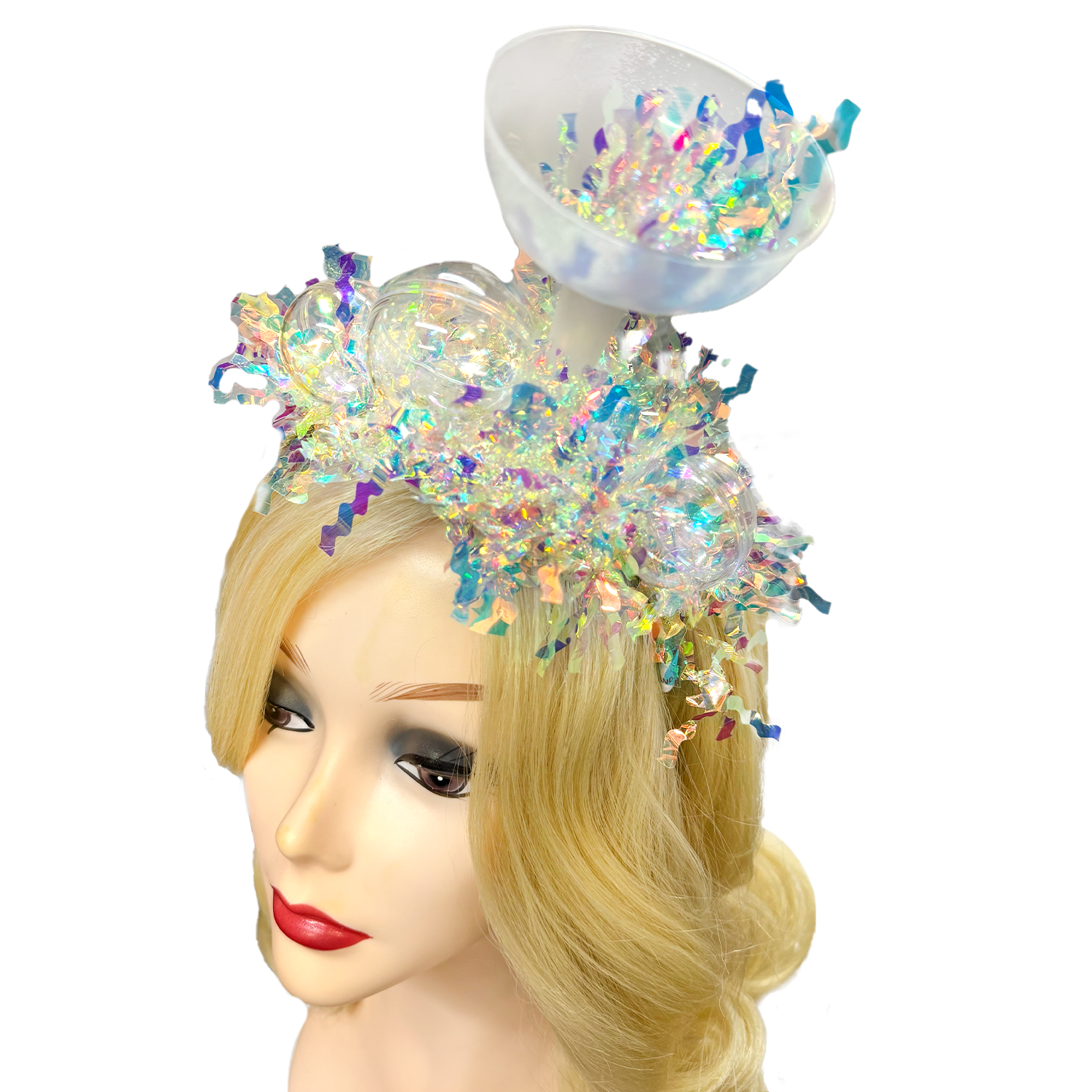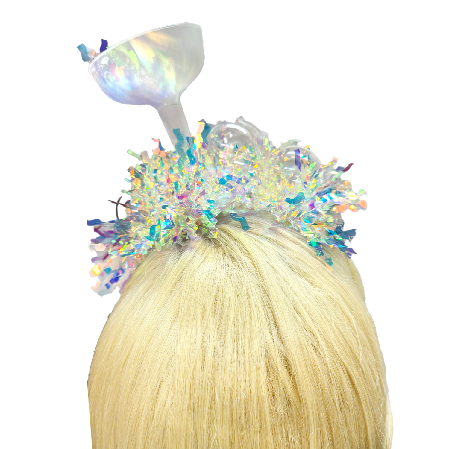 Hit 'em with some serious fizz in this Bubbly Champagne Headpiece! This iridescent headpiece features color-shifting zig zag tinsel fringe, clear plastic bubble detail, and an adorable mini champagne glass piece that'll have you feeling cheers-y at any New Years Eve party!