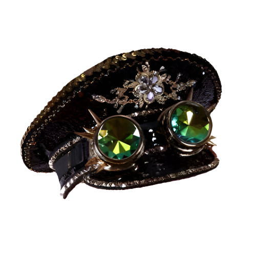 Add some glamorous sci-fi vibes to your outfit with this Black Spiked Goggles Fisherman Hat! This cute captain's hat is decorated with shimmery black and gold sequins, rhinestones, and kaleidoscopic spiked goggles with a metallic gold finish.