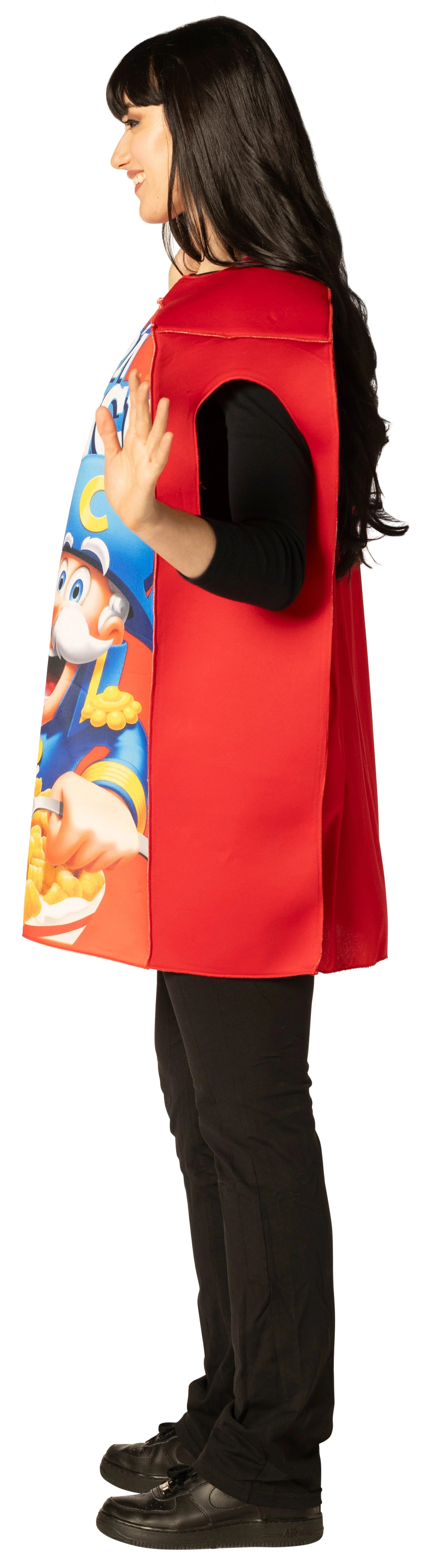 Set sail on the seas of fun and flavor with the Cap’n Crunch Cereal Box Costume! Perfect for breakfast lovers, cereal enthusiasts, and anyone who’s ever wanted to be a walking, talking breakfast treat. This costume includes a foam tunic in the shape of the Cap'n Crunch Cereal box and is printed on the front only in likeness of the actual product with a polyknit back. It features open arms for easy eating and drinking.