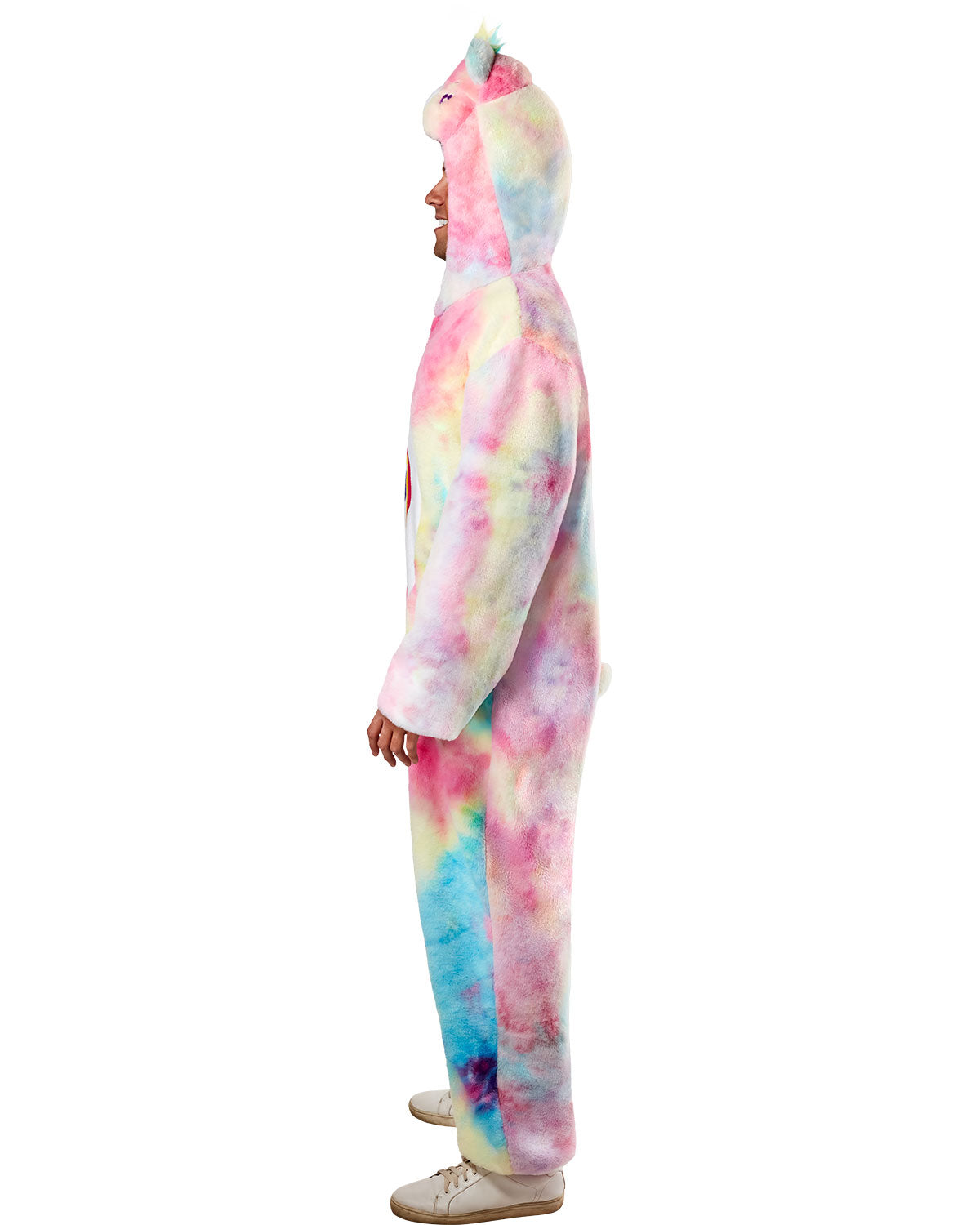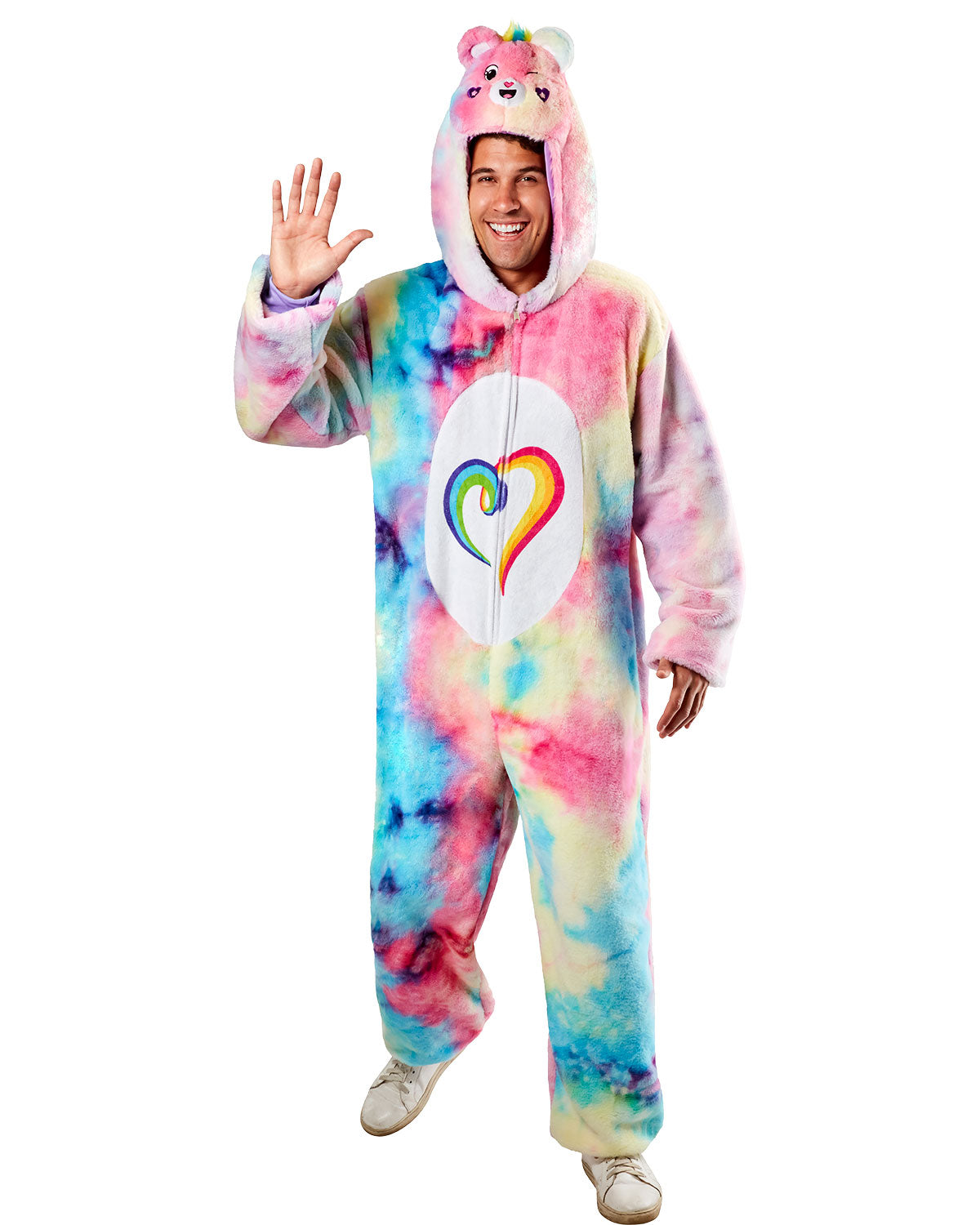 Nothing says "love all" like this adorable Togetherness Bear Adult Costume! Perfect for lounging or a fun costume, this jumpsuit features the pastel rainbow markings of Togetherness Bear. Made for adults, it's soft and warm, making it the ultimate comfort attire.