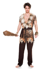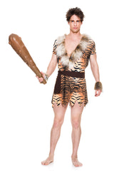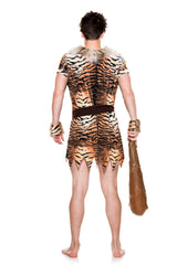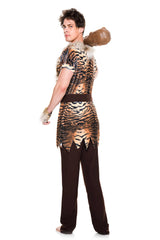 Take a walk on the wild side with this Cave Man Men's Sexy Costume! Featuring a sexy tiger print tunic with playful faux fur accents, this sexy prehistoric look is perfect for turning heads at any costume party.