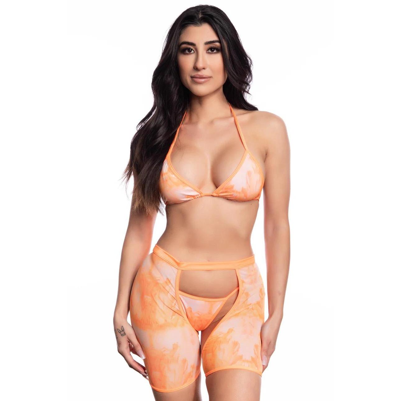Turn heads with our sassy Chap Set! This playful three-piece ensemble features a flirty triangle bikini top with halter straps and tie back, paired with low-rise bottoms boasting a cheeky scrunch back that accentuates your assets. Complete the look with matching open-crotch chaps featuring an adjustable band and convenient hook closure. One size fits most, so grab yours in marmalade or butterfly/flutter prints and strut your stuff with confidence!