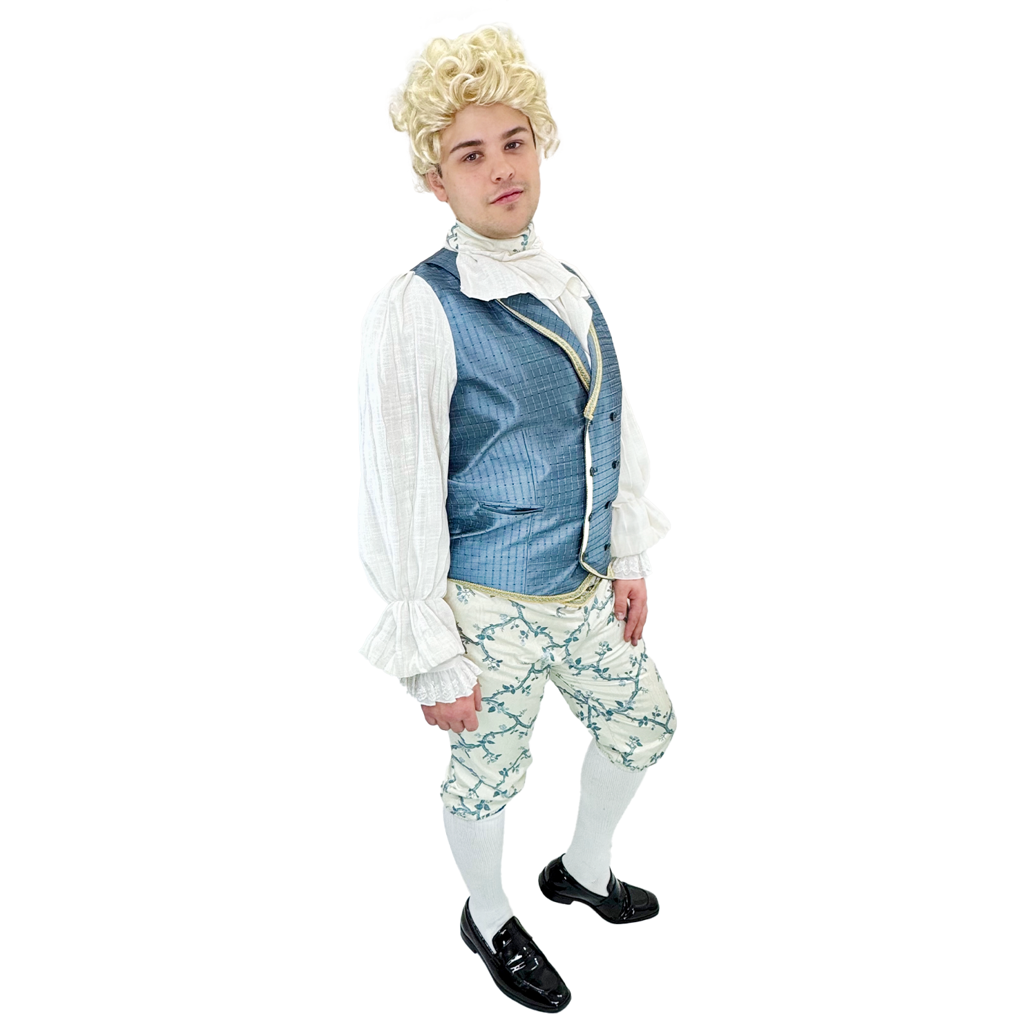 Experience the elegance of the past with our Classy Colonial Blue Duke Men's Adult Costume. Handcrafted with attention to detail, this Georgian inspired costume features a silver vest and attached sleeves, white and blue pants, and an attachable jabot collar for a polished look. Available in sizes large and extra large, this exclusive Abracadabra design will transport you back in time. Wigs and accessories available for purchase separately online or in store.
