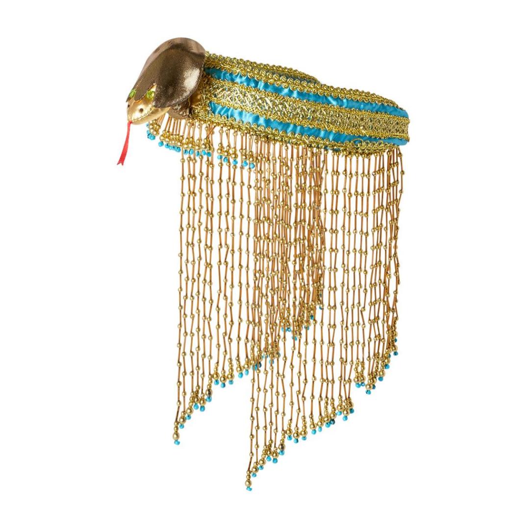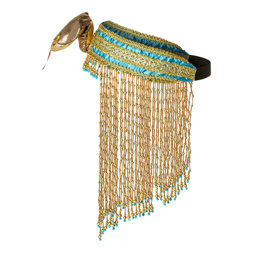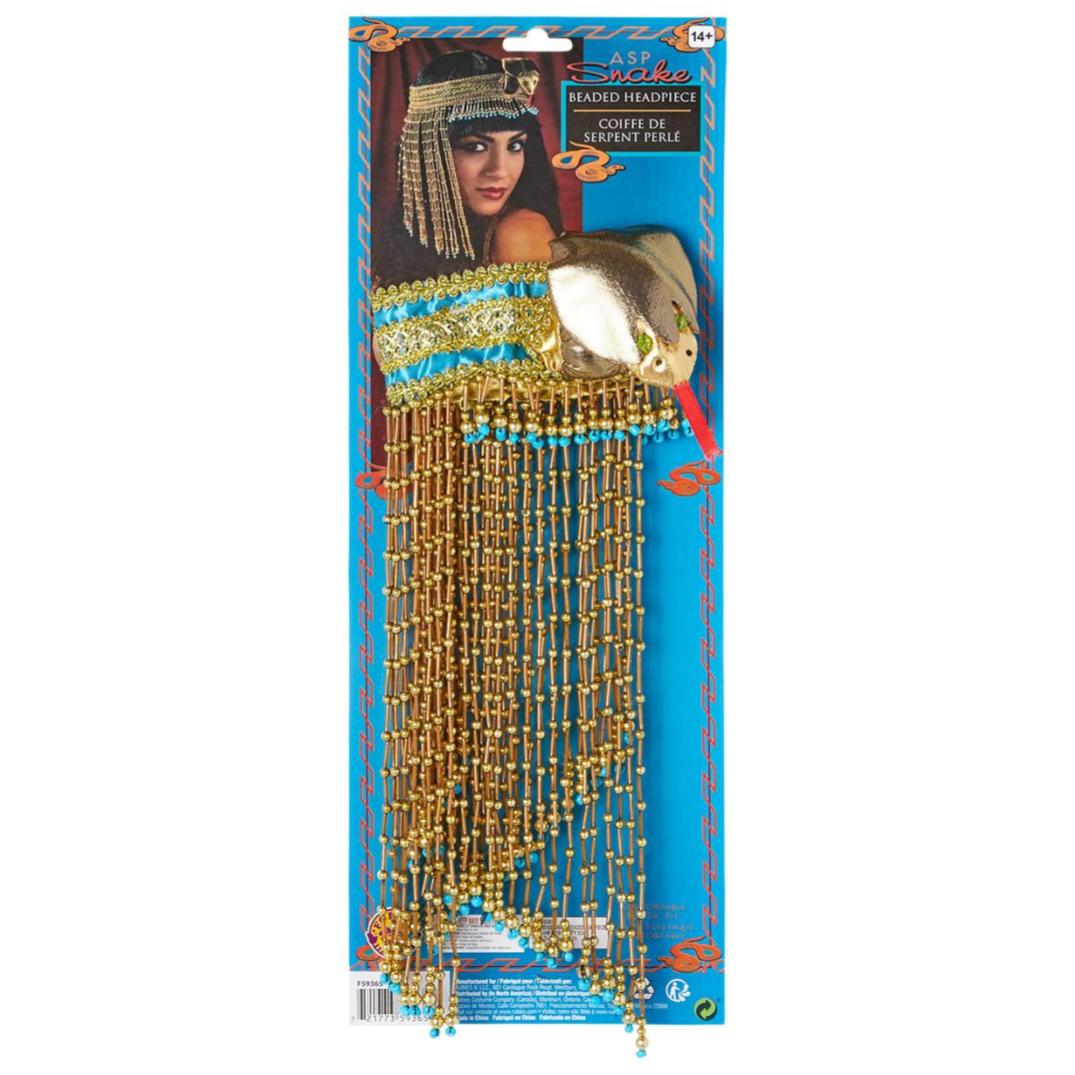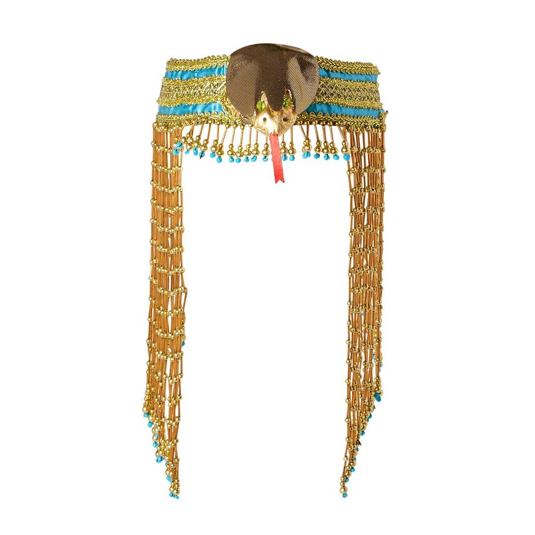 Bring the aesthetic of ancient Egypt to your costume with this luxurious looking Cleopatra Asp Beaded Headpiece! With elegant gold beaded drapes and a cobra head centerpiece, this cap adds a touch of regal style to any Cleopatra costume.