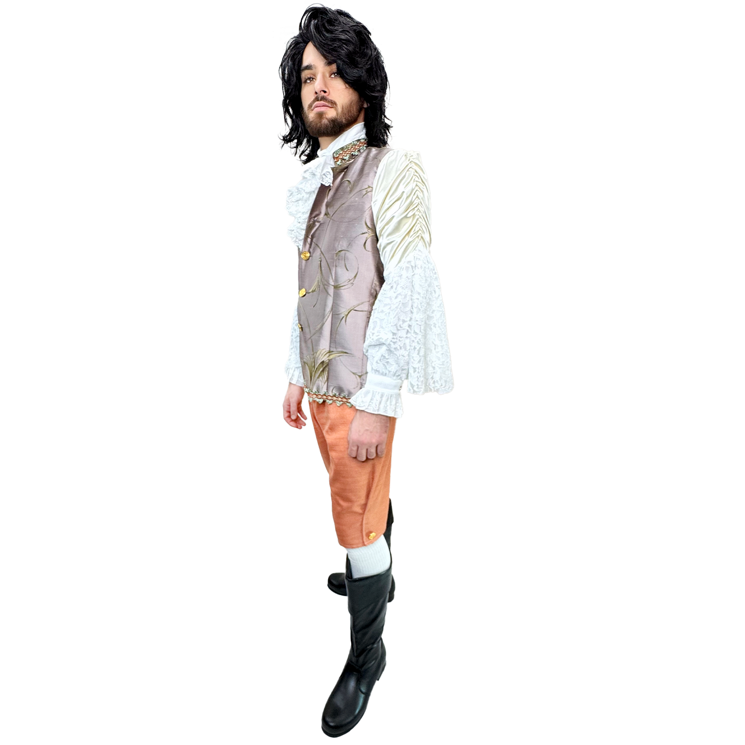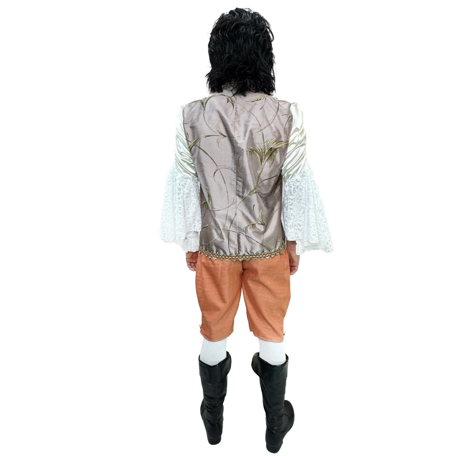 Unleash your inner colonial gentleman with our Colonial Floral Count Men's Adult Costume. The silver jacket features delicate floral embellishments and lace sleeves, while the orange culotte style pants add a pop of color. Available in size medium. Complete the look with our range of accessories. Historical accuracy meets fashion in this one-of-a-kind costume.