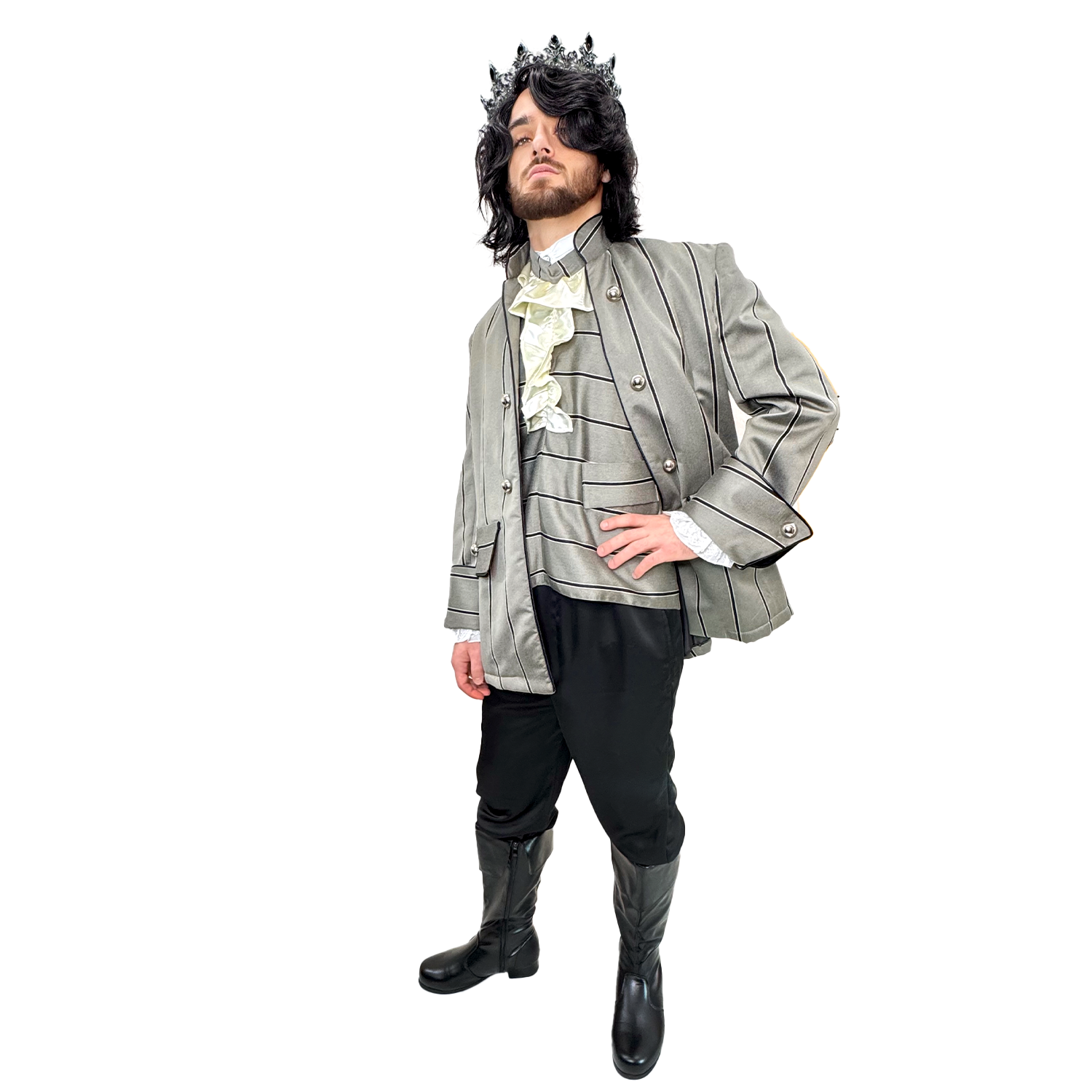 This Colonial Silver Striped Lord Men's Adult Costume is a true representation of colonial Georgian fashion. The silver striped jacket and vest, paired with the comfortable black culotte style pants, create an authentic look. Perfect for any costume party, this outfit is available in size small and accessories can be purchased separately.