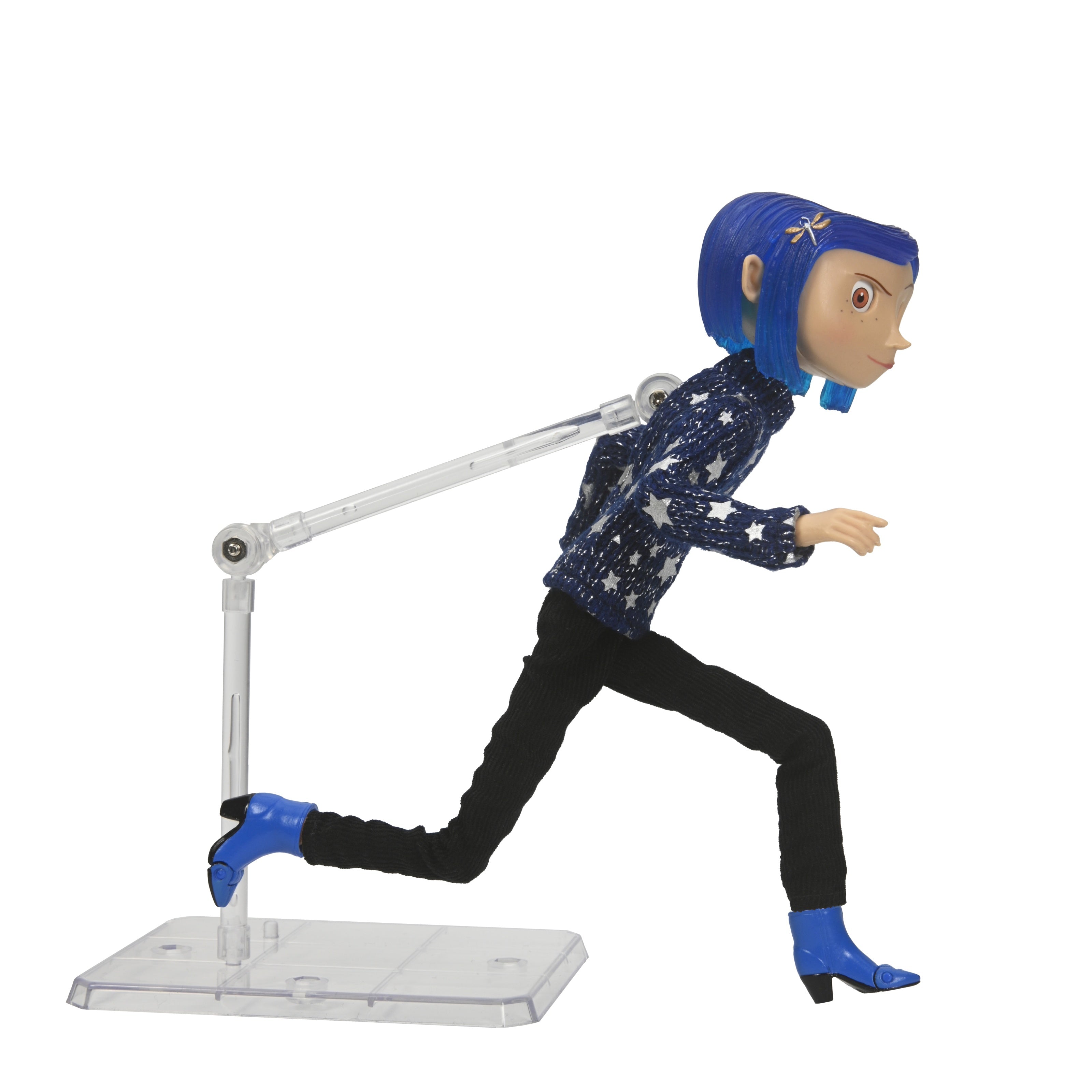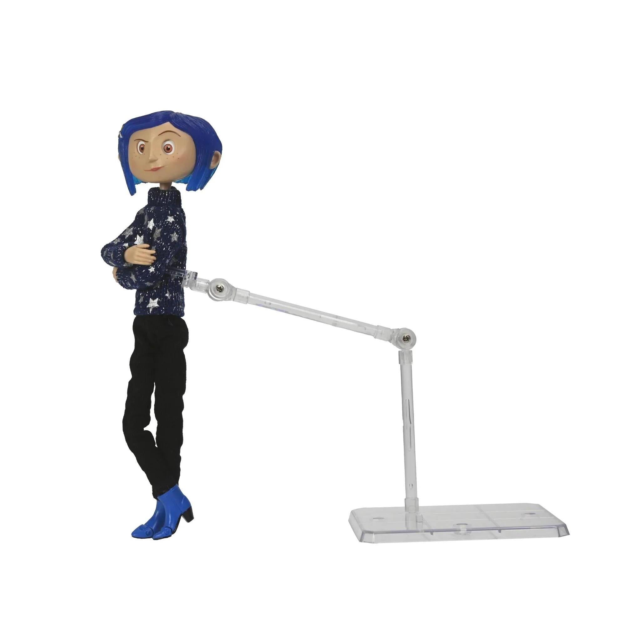Step into the whimsical and eerie world of Coraline with this stunning 7" articulated action figure, faithfully crafted in the likeness of LAIKA's stop-motion heroine. Dressed in her cozy navy-blue sweater patterned with shimmering silver stars, Coraline looks like she stepped right out of the screen and into your collection. With her signature electric blue bob and a knowing smirk, she’s ready to explore alternate realities—or just hang out on your shelf looking cool.