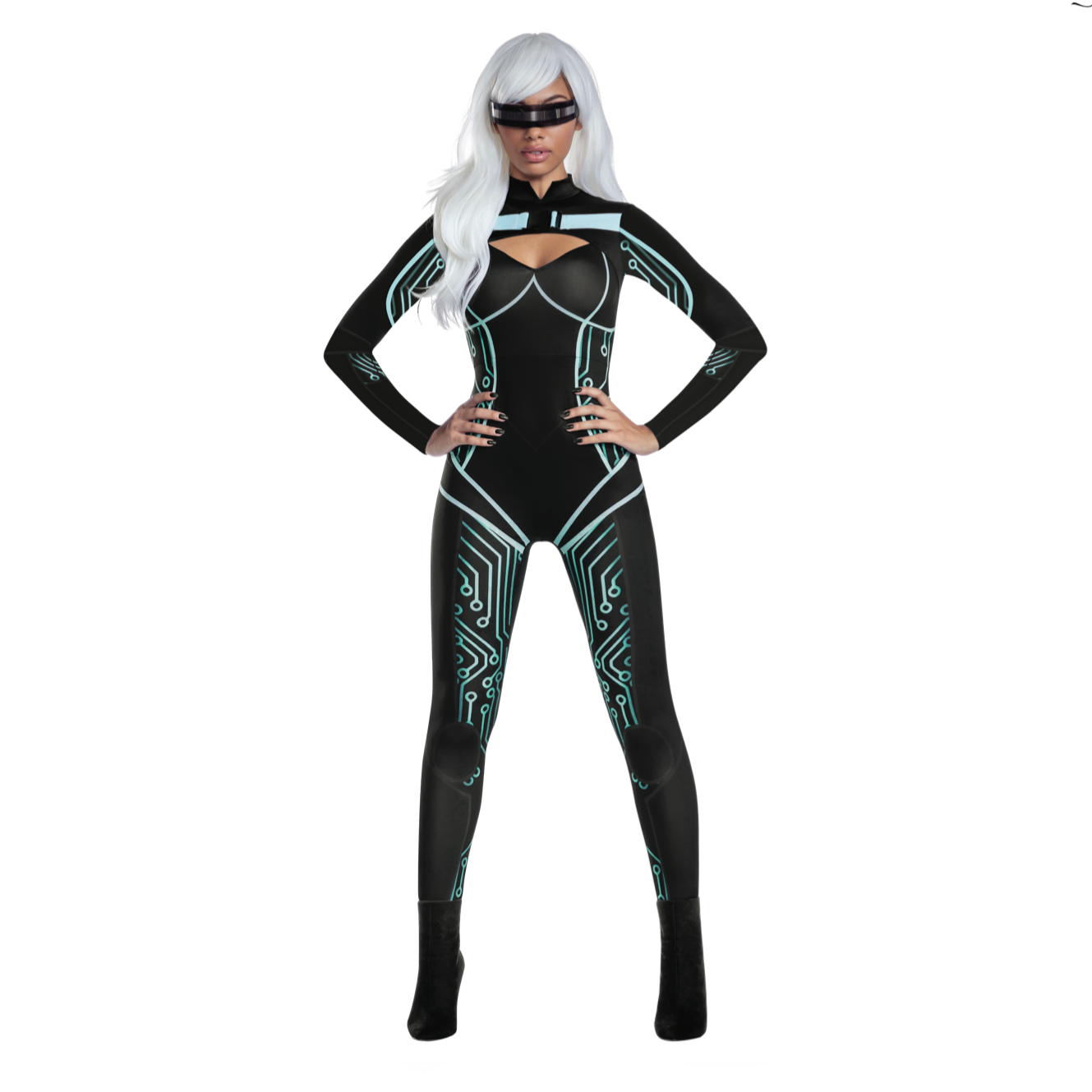 Get ready to override the competition in this unbelievably hot Cyber Babe Costume! This circuit-printed jumpsuit comes with a pair of sleek futuristic shades that make a versatile look for any costume party with endless options for accessorizing for android, alien, cyberpunk, and other sci-fi looks!