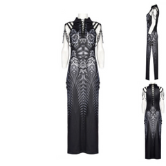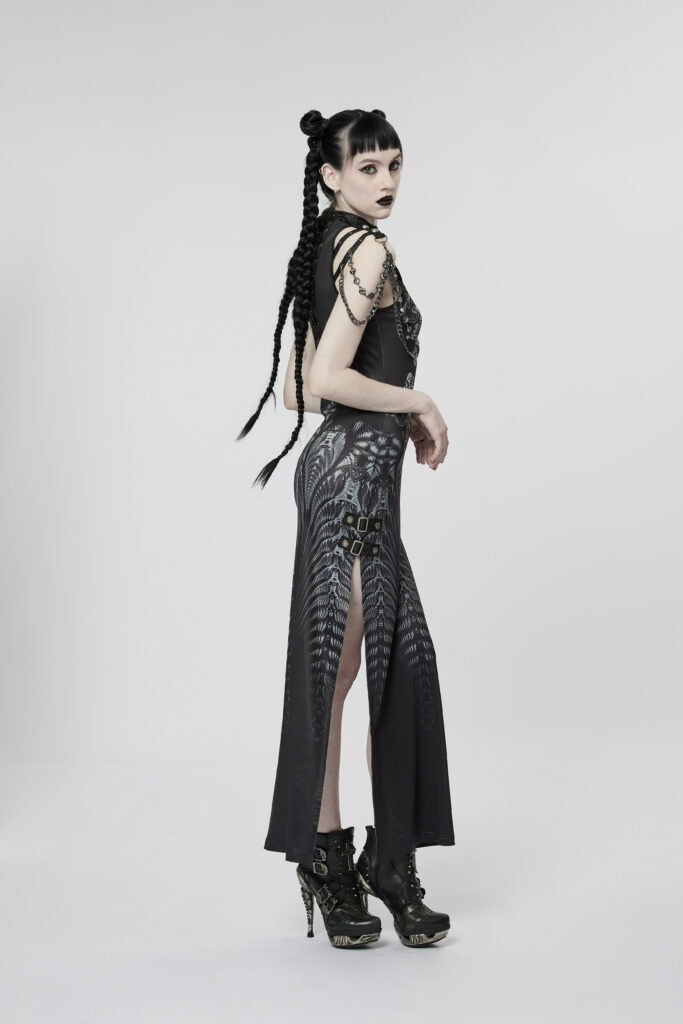Unleash your inner cyber babe with this black/grey maxi dress featuring a daring side split hem. Perfect for any futuristic affair, this dress is sure to turn heads. Embrace your edgy side (and show some leg!) with this bold and stylish piece.