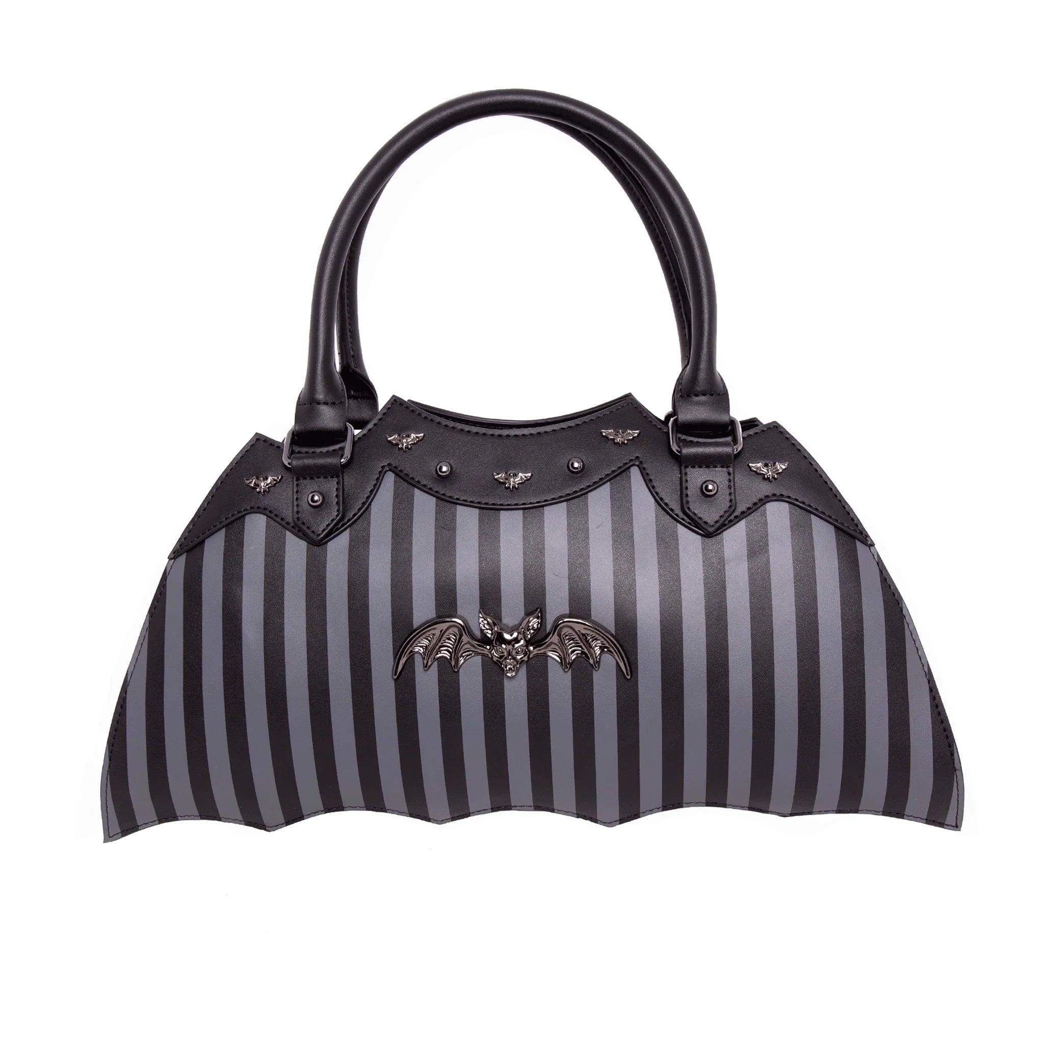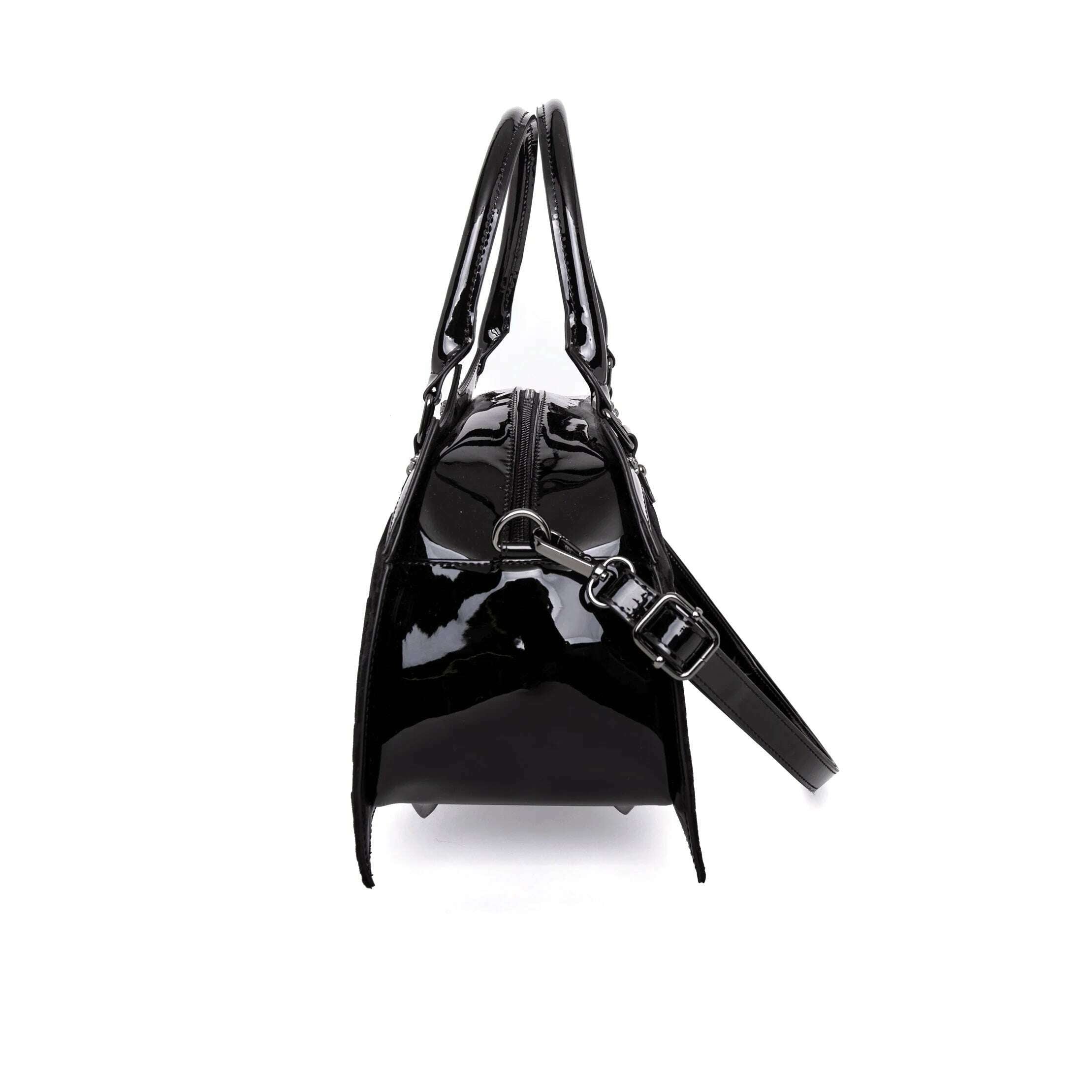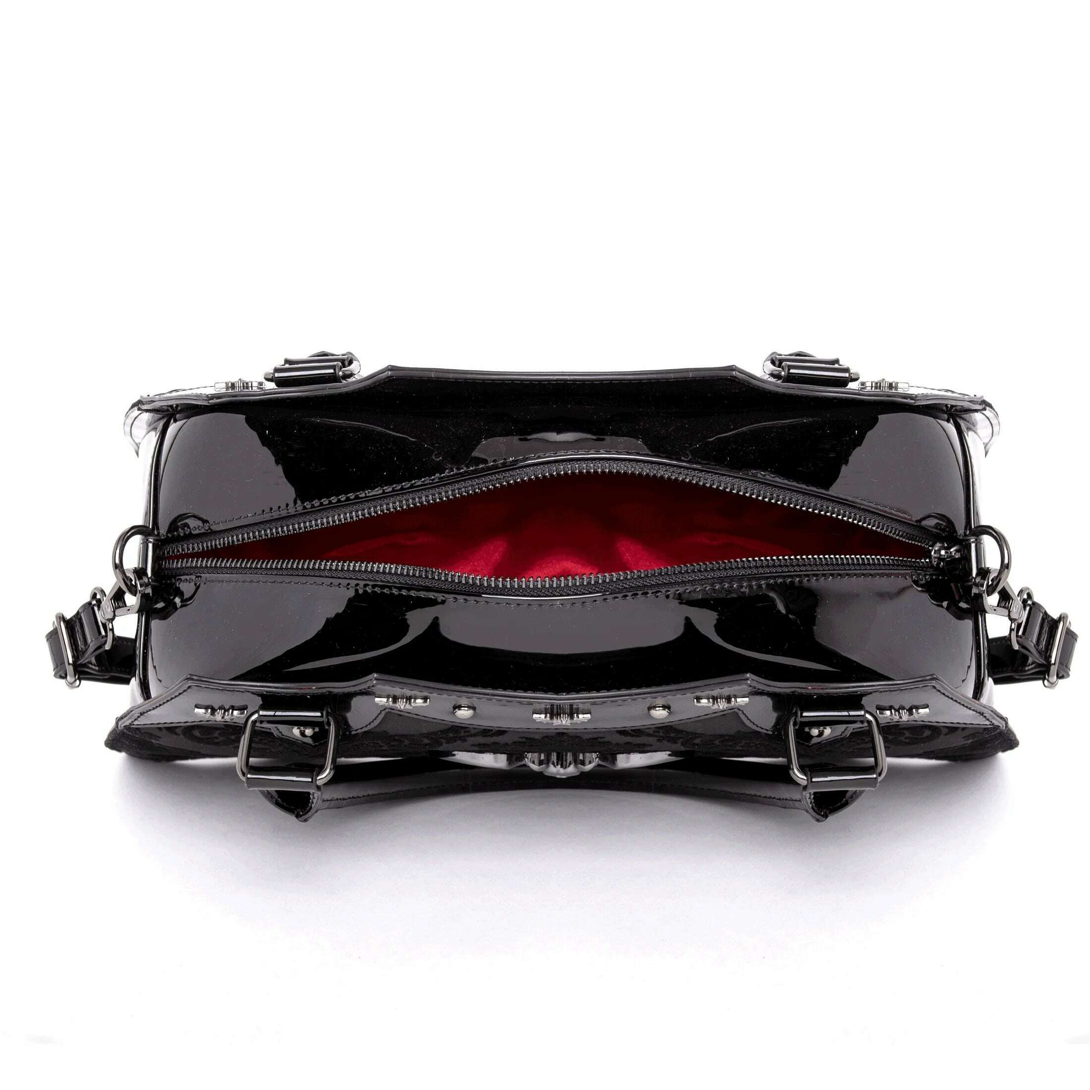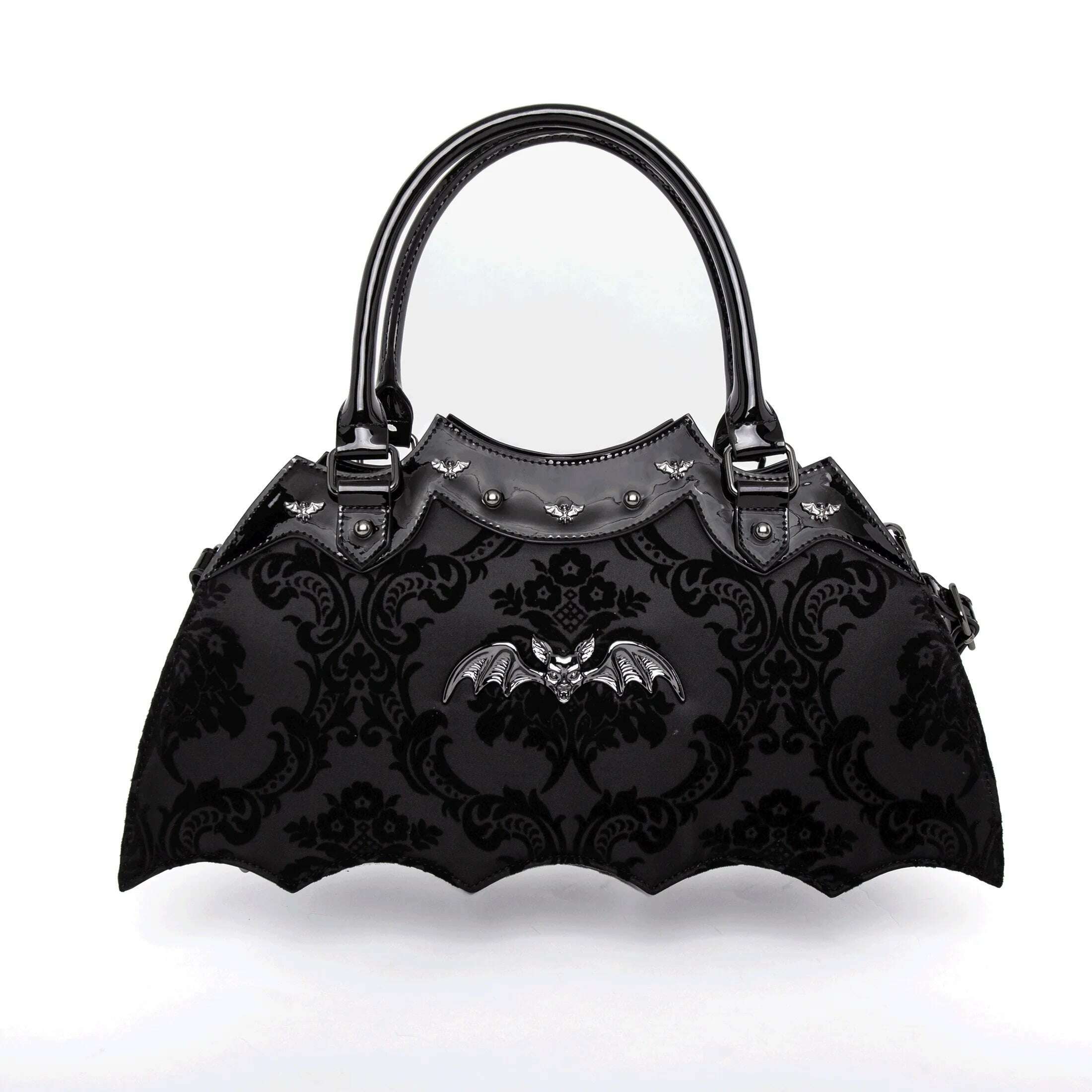This handbag boasts a posh matte satin finish and unique flocked velvet damask design, paired with edgy custom bat and dome studs and a high-quality vegan PU leather trim. Whether you use the included cross-body strap or not, this bag is ready to make a statement and turn heads at any event.