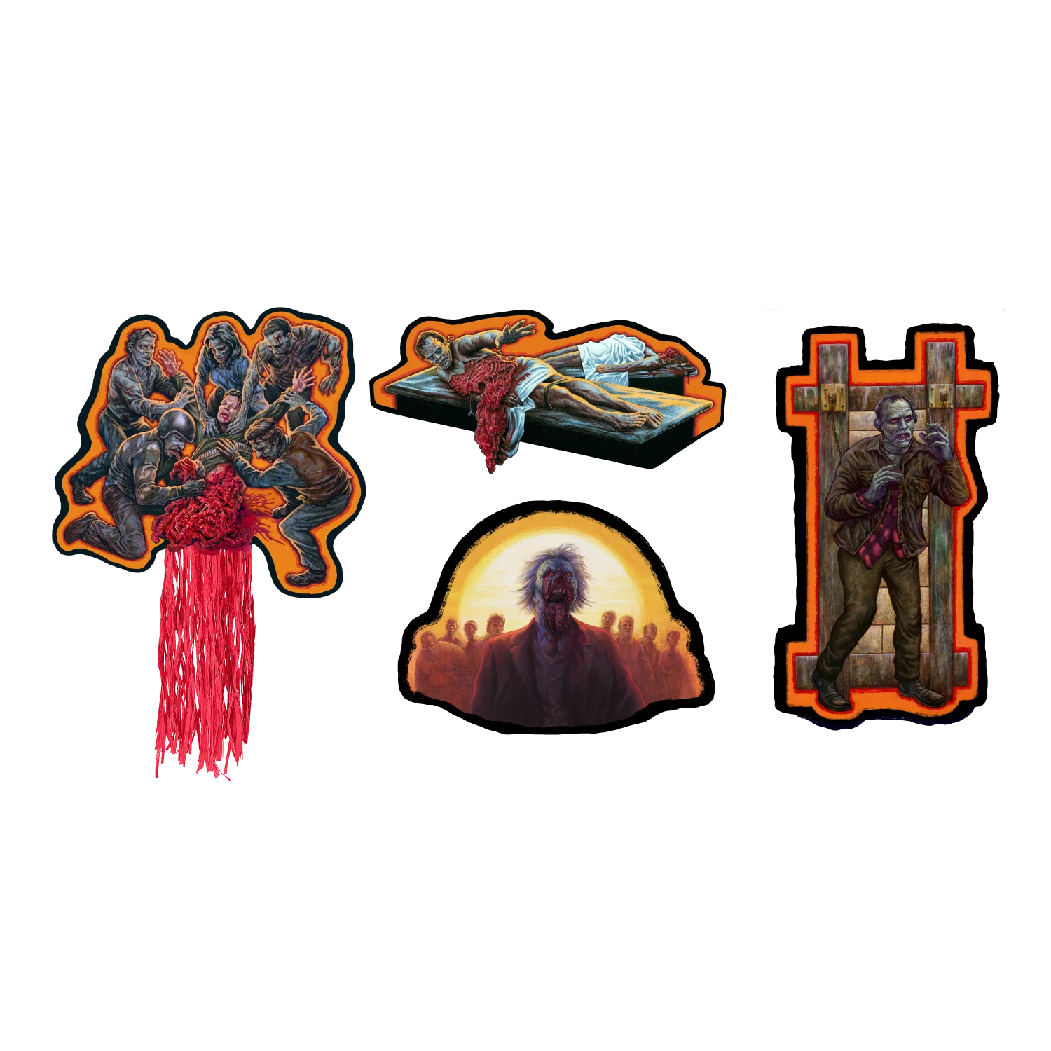 This amazing collection of Day of the Dead Wall Decor Cutouts comes with four full color wall decor designs, one with streamer guts detail. Each piece in this collection was designed and drawn in a vintage style, similar to the classic Halloween wall decor from the early 60's. Printed on thick 300 gsm, coated paper, perfect to reuse for many Halloween parties to come.