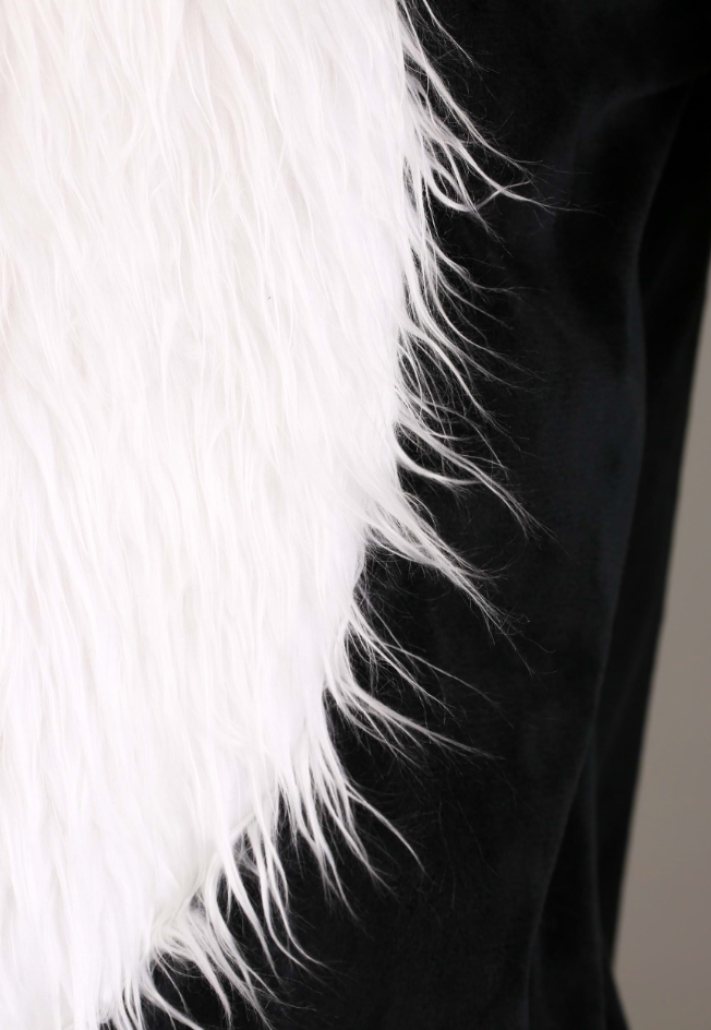 - Velour jumpsuit has faux fur belly inset, foam-backed bow tie at front neck