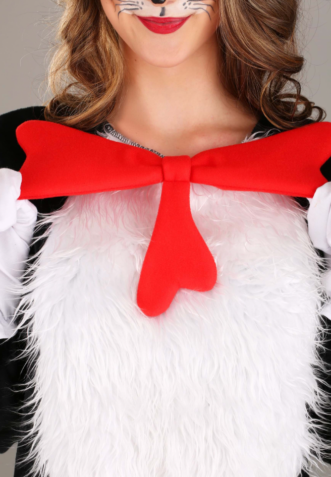 This black jumpsuit features an attached stuffed black tail, a white faux fur belly patch, and an oversized red bow tie, just like the real Cat in the Hat! The outfit also comes with an oversized striped hat with a clever pocket in the lining, so you can carry your valuables without changing the look. The white gloves complete the transition!