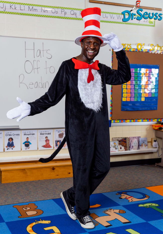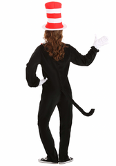 This black jumpsuit features an attached stuffed black tail, a white faux fur belly patch, and an oversized red bow tie, just like the real Cat in the Hat! The outfit also comes with an oversized striped hat with a clever pocket in the lining, so you can carry your valuables without changing the look. The white gloves complete the transition!