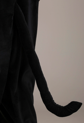 - Velour jumpsuit has faux fur belly inset, foam-backed bow tie at front neck
