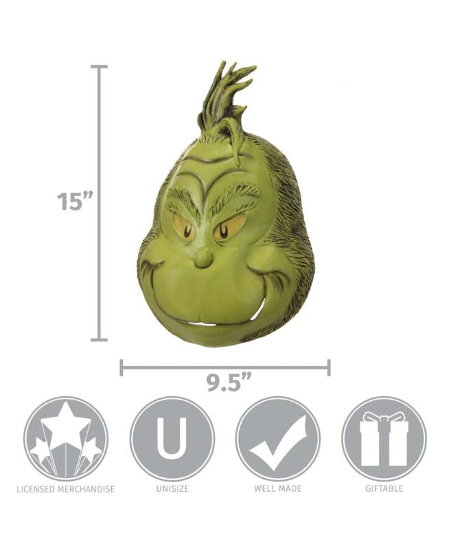 Designed after the Grinch in the beloved children's book, this mask features fully painted and pliable latex. The custom molded face details everything from the glowing yellow eyes, horrible smile, and tufts of sculpted hair at the crown. You won't miss a thing at your party, thanks to the easy to see out of mesh over the eyes. This mask will even fit Whos tall and small, thanks to the silicone elastic band fastener!