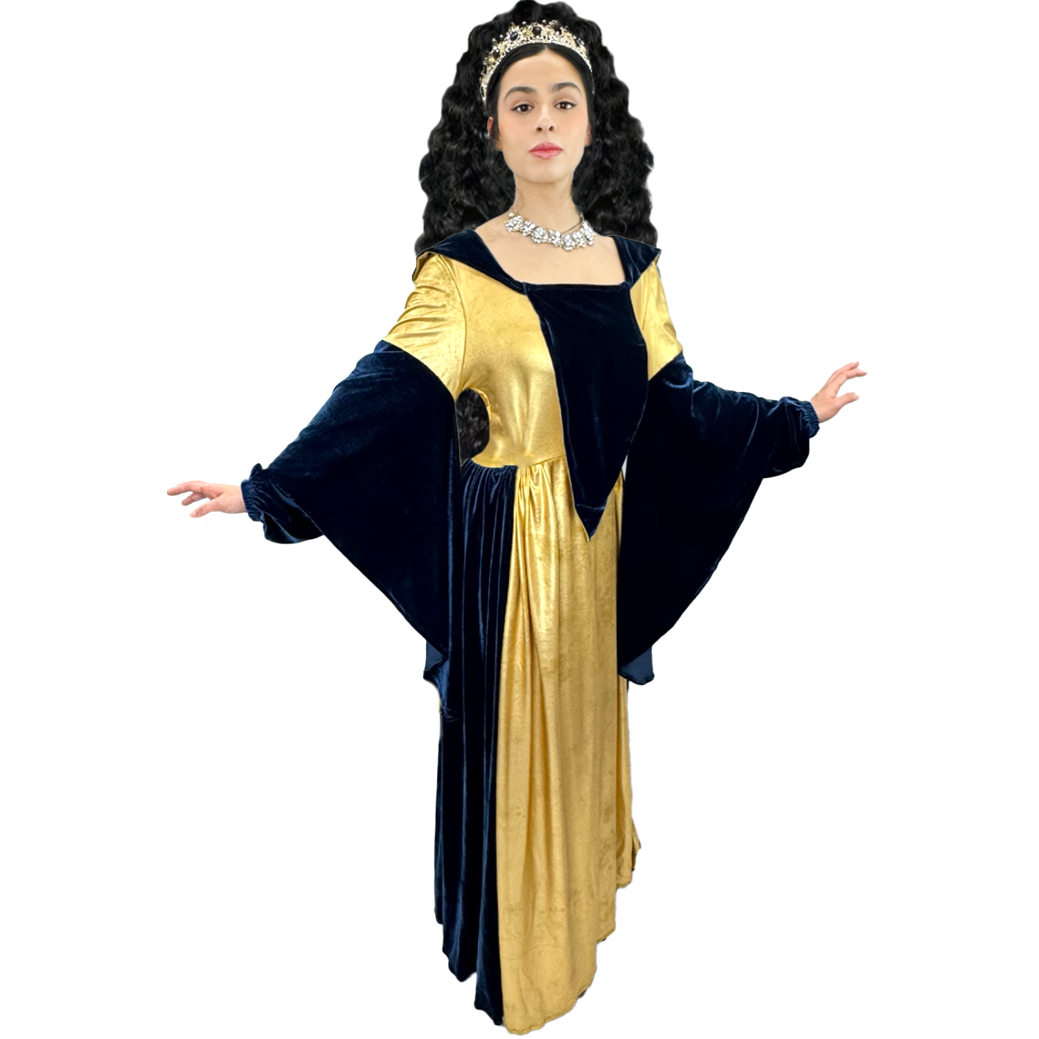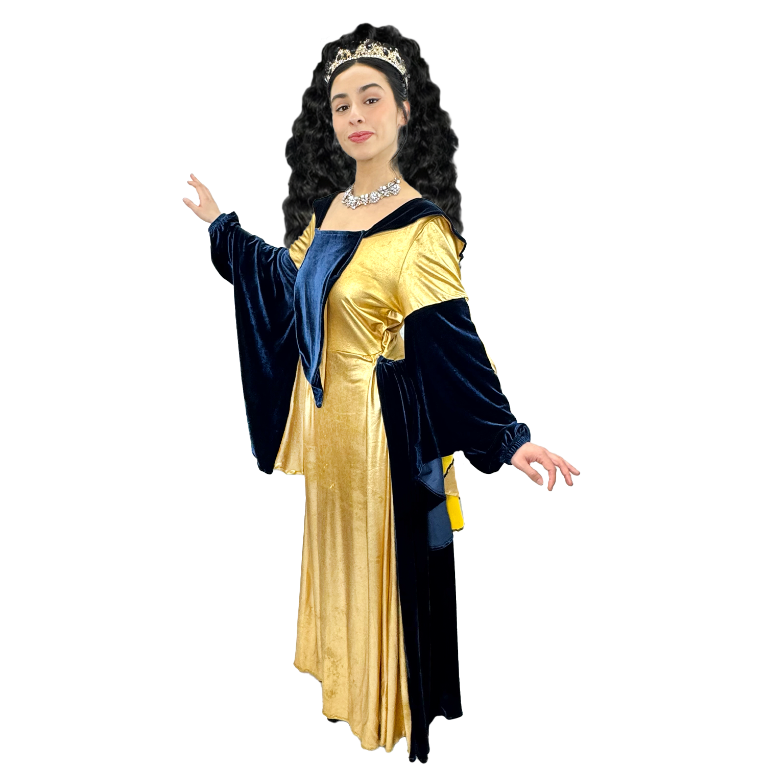 Elevate your costume game with our Deluxe Medieval Gold & Blue Queen Adult Costume. This regal dress, designed with stunning gold and blue details, will transport you to another time. Available for purchase or rent in size large, add the perfect finishing touches with our wide selection of accessories.