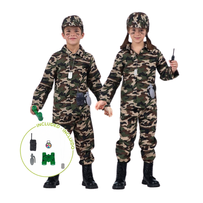 Your little cadets are in for some major fun with this Deluxe Soldier Costume set! Not only does it include a full camo print uniform, but it comes with tons of play accessories so they'll be ready for all kinds of special ops, be it Halloween, career day, or playtime in the backyard!