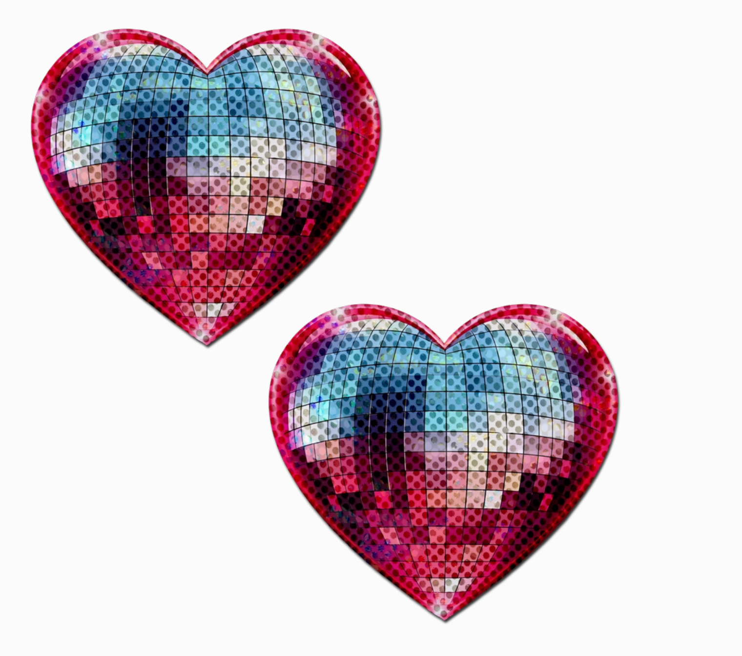 Add some sparkle and fun to your outfit with these Discoball Heart Breast Pasties in Sparkling Blue & Pink. Perfect for festivals, parties, or a playful night out, these pasties will have you dancing all night long. So get ready to turn heads and embrace your inner disco diva!