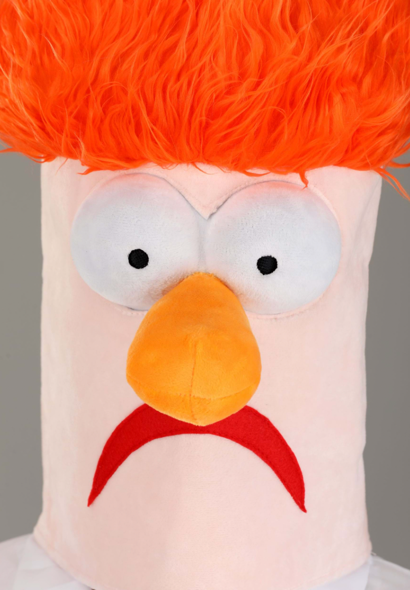 Beaker's mad scientist hairdo is attached to the top of this mask. It is made with faux fur that has been styled in a very Beaker-like fashion. This Muppet's bulging eyes and large nose are attached to the front of the mask. They are stuffed with soft fiberfill to ensure they hold their shape. The black pupils are small mesh covered holes sewn into the white eyeballs. Beaker's partially open crescent mouth is sewn onto the mask just below his nose.