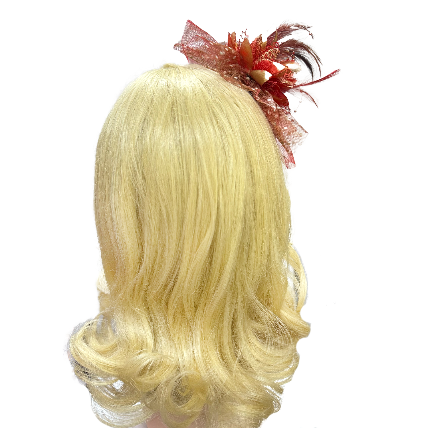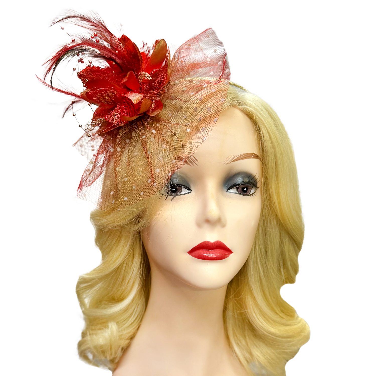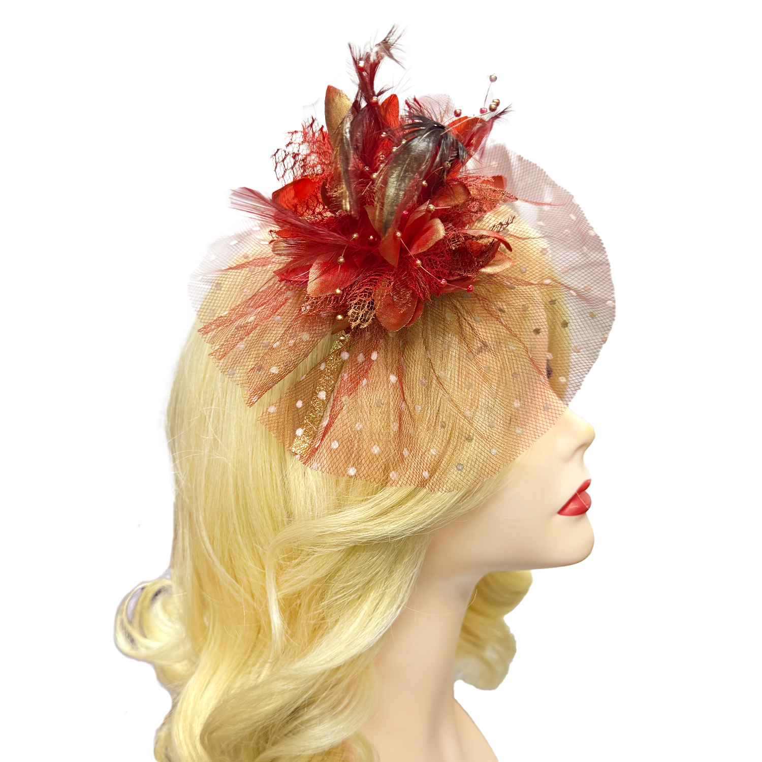 Add a fiery burst of color to your flapper costume with this lively Ember Veiled Feather Fascinator! This handmade headpiece features a sheer dotted veil topped with a small red flower, black feather accents, and a spritz of gold shimmer.