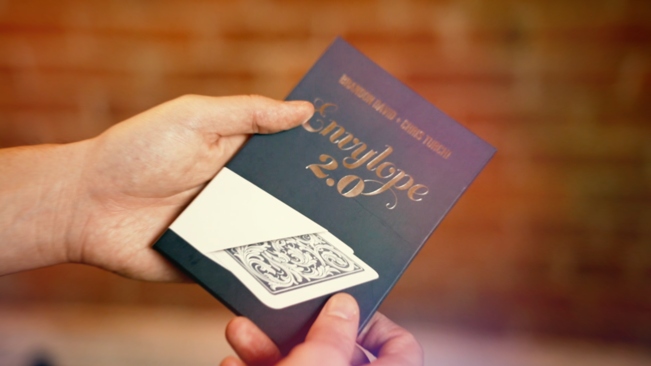 A small white envelope is examined by the audience. The envelope is then placed in the performer’s back pocket. A deck of cards is brought out. One card is signed and then lost in the deck. The deck then visually transforms into a small white envelope, and inside the envelope is the signed card. The deck is then discovered in the performer’s back pocket.