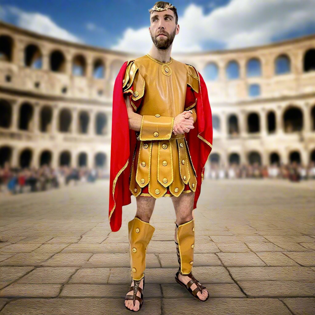 Take your costume a colossal step above the rest with this Exclusive Production Quality Roman Soldier Adult Costume! Crafted with a gold color tunic, faux leather armor and grieves, a red cape with gold trim, and a golden Roman leaf crown, this authentic looking uniform will lead you to guaranteed glory whether it's on set or at a party!