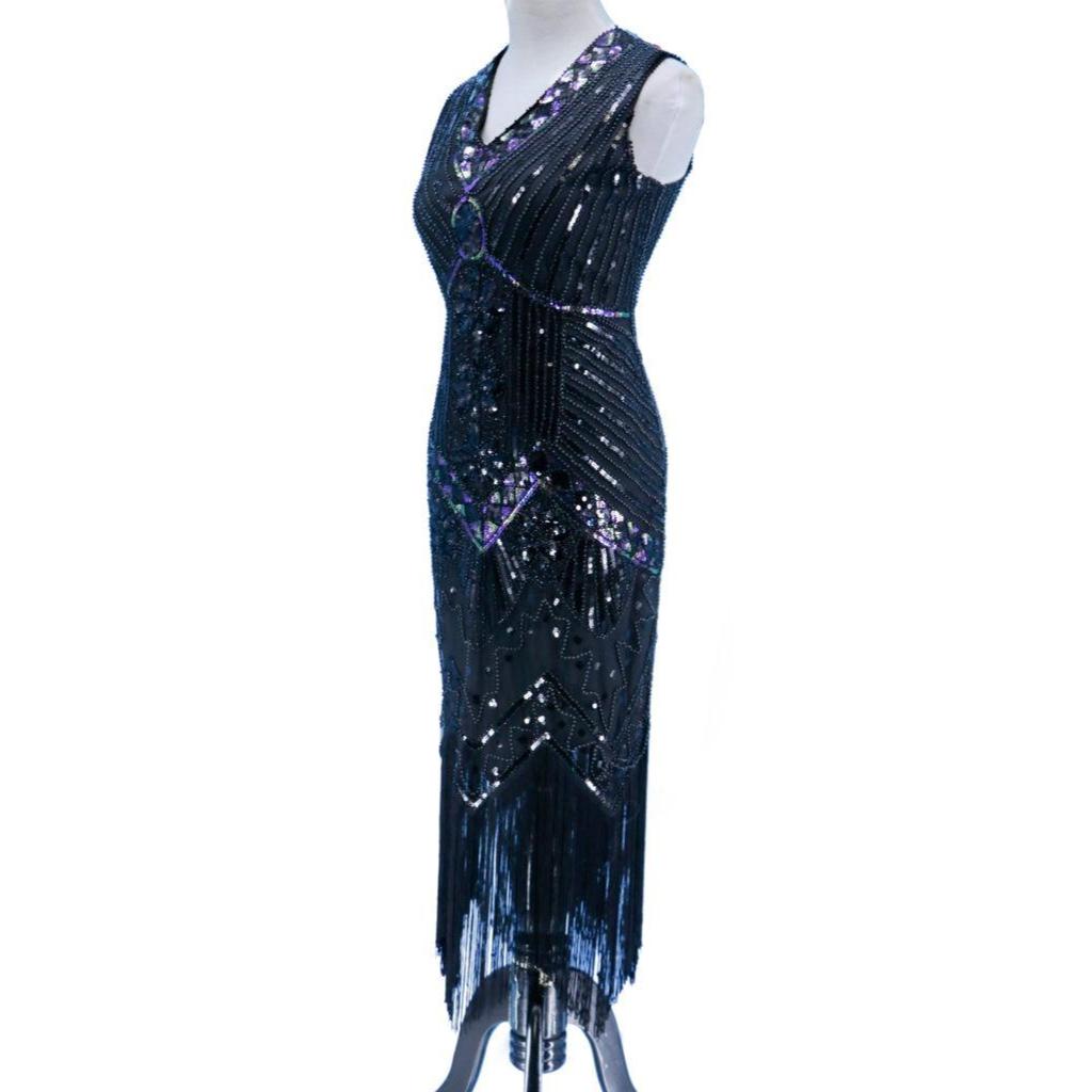 Step back in time with our Flapper Art Deco Dress! This stunning dress is a nod to the roaring 20s, with its beaded detailing and fringe hemline. Get ready to turn heads at your next event with this flirty and glamorous piece.