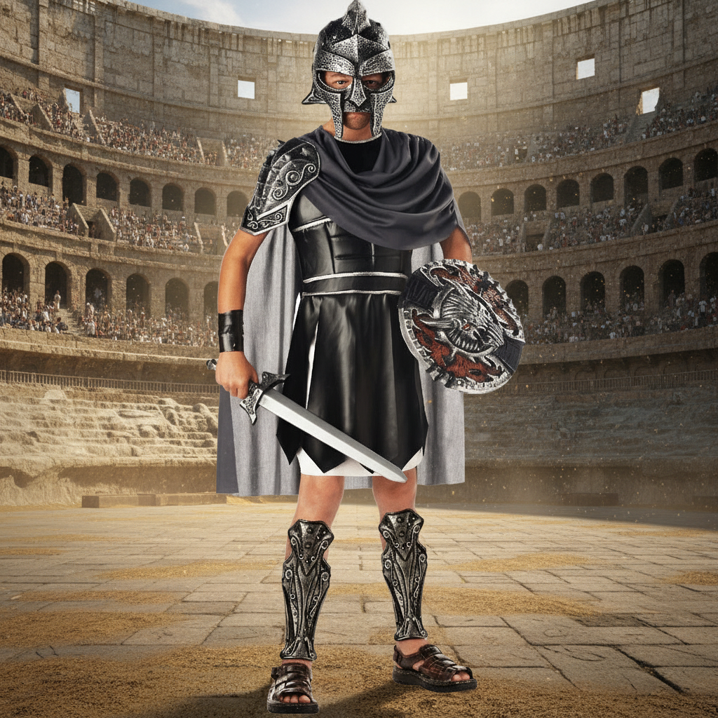 A lot of the men who entered the Roman Colosseum or the fighting pits entered as slaves. These might have been soldiers who lost their rank dishonorably, or men captured from conquered lands whose freedom was stripped of them. Many of these men abandoned their true names and gave themselves over to the idea that they were going to die no matter what, so they might as well do so with some semblance of glory. This is what you see showing through with stunning detail in this Gladiator costume.