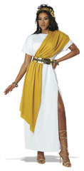 Revel in your own Olypmian radiance with this simple yet stunning Goddess Toga Women's Costume! This Greek inspired toga dress features a colorful sash and comes with a shiny gold headpiece that'll make you feel like a true deity at any theme party. Also great for stage productions!