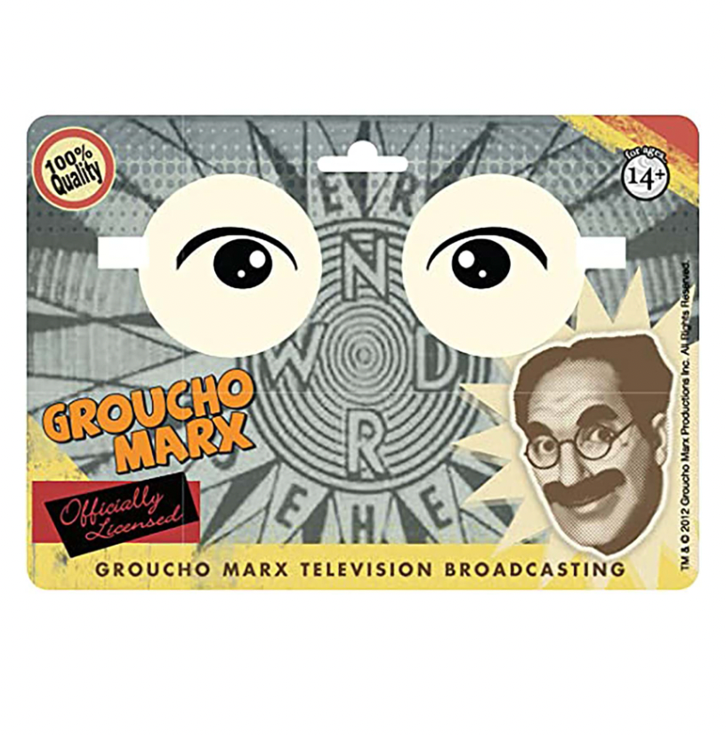 The officially licensed disguise is based on Groucho Marx’s trademark appearance. The accessory starts with a pair of thick-rimmed plastic glasses frames. Attached to the bridge of the frames is a sizeable soft-plastic nose to imitate Groucho’s iconic sniffer. A set of thick black eyebrows and a mustache inspired by Groucho’s signature greasepaint facial hair polishes the look. Pair the glasses with your favorite suit, grandpa cardigan, or best vaudeville-influenced costume, then hit the streets with your unique talents!