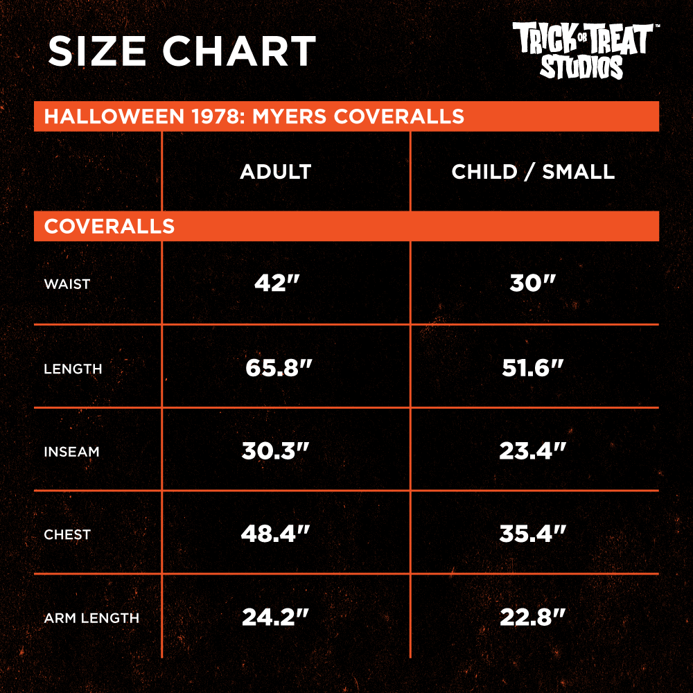 Designed by Emily Gunshor, these Halloween Kills - Michael Myers Child Coveralls are a beautiful version of the coveralls worn by Michael Myers in the 2021 film Halloween Kills. Every detail from the screen-used coveralls is represented on this high-quality costume. So order the official Halloween Kills - Michael Myers Adult Coveralls and give your friends the ultimate scare this Halloween! These are one size fits most for Children, please read the size chart in the product images before ordering. Mask and knife sold separately. These come in Standard and XL.