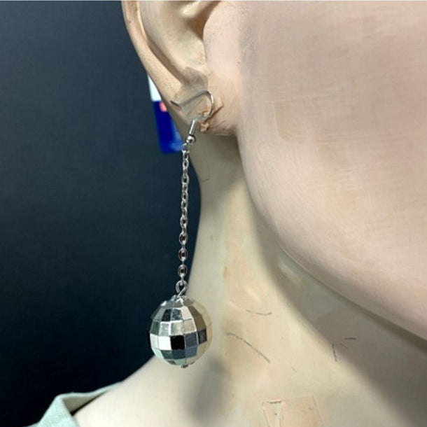 Add some sparkle to your wardrobe with these Hanging Silver Disco Ball Earrings. These fun and playful earrings will make a statement and add a touch of disco vibes to any outfit. Perfect for a night out or a party, these earrings will make you shine like a disco ball!