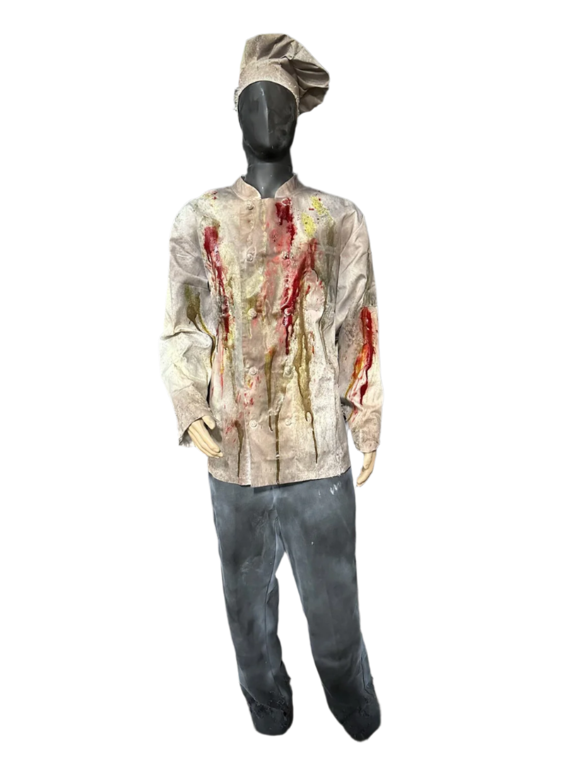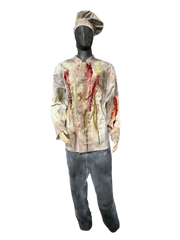 Unleash your inner chef and killer with our Haunted Mansion Collection Chef Adult Costume. Perfect for a murder mystery party or Halloween, this creepy costume features hand-distressed details and includes a chef's apron, hat, and slacks. Available to rent or buy in size large. Satisfaction guaranteed.