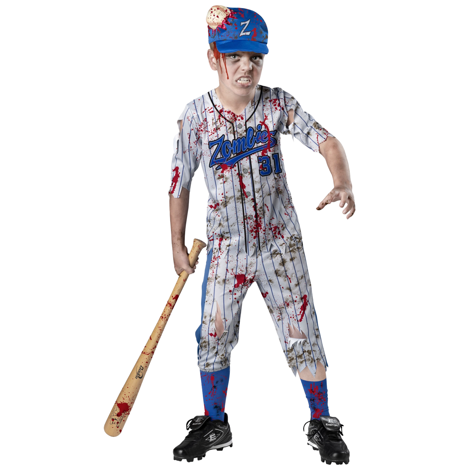 Be the scariest home run king in the costume party with this HomeRun Horror Baseball Player Kid's Costume! Say goodbye to batting average and hello to spooktacularly long, spooky home runs with this costume that will have everyone at the party shrieking with fear (and maybe some cheers too). Includes Hat, shirt and pants.Bat not included.