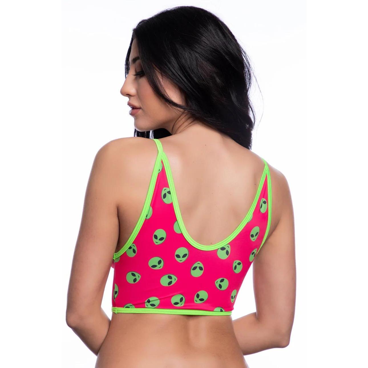 Beam yourself into style with this out-of-this-world Hot Pink Alien Pattern Crop Top! Featuring adorable green alien heads dancing across a vibrant pink backdrop, this playful crop top comes complete with spaghetti straps, scoop neckline, and matching green trim. The flirty scoop back adds extra flair to this one-size-fits-most galactic fashion statement. Complete the look with matching shorts (sold separately) for an ensemble that's totally cosmic!